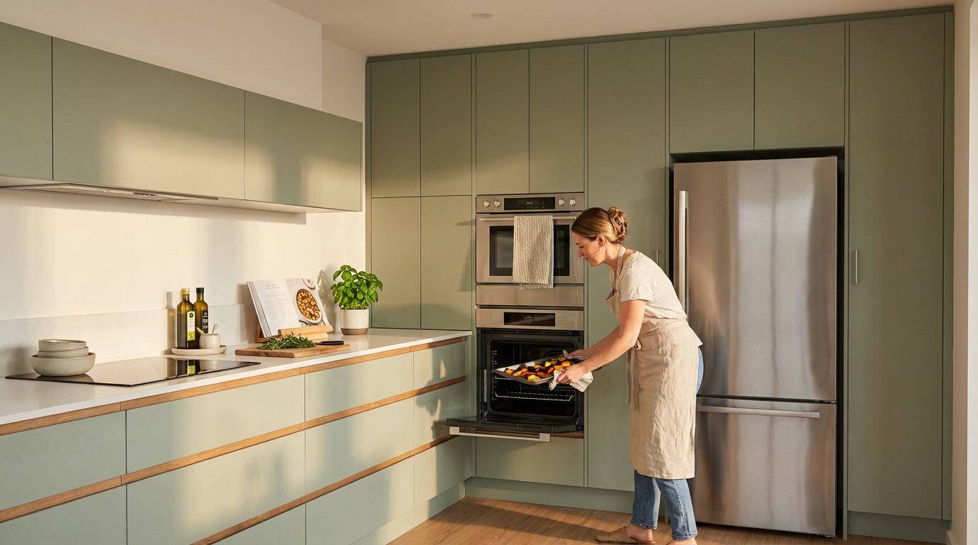 add natural lighting into space add kitchen decor have a lady standing at the sink washing her hands make the window frame black