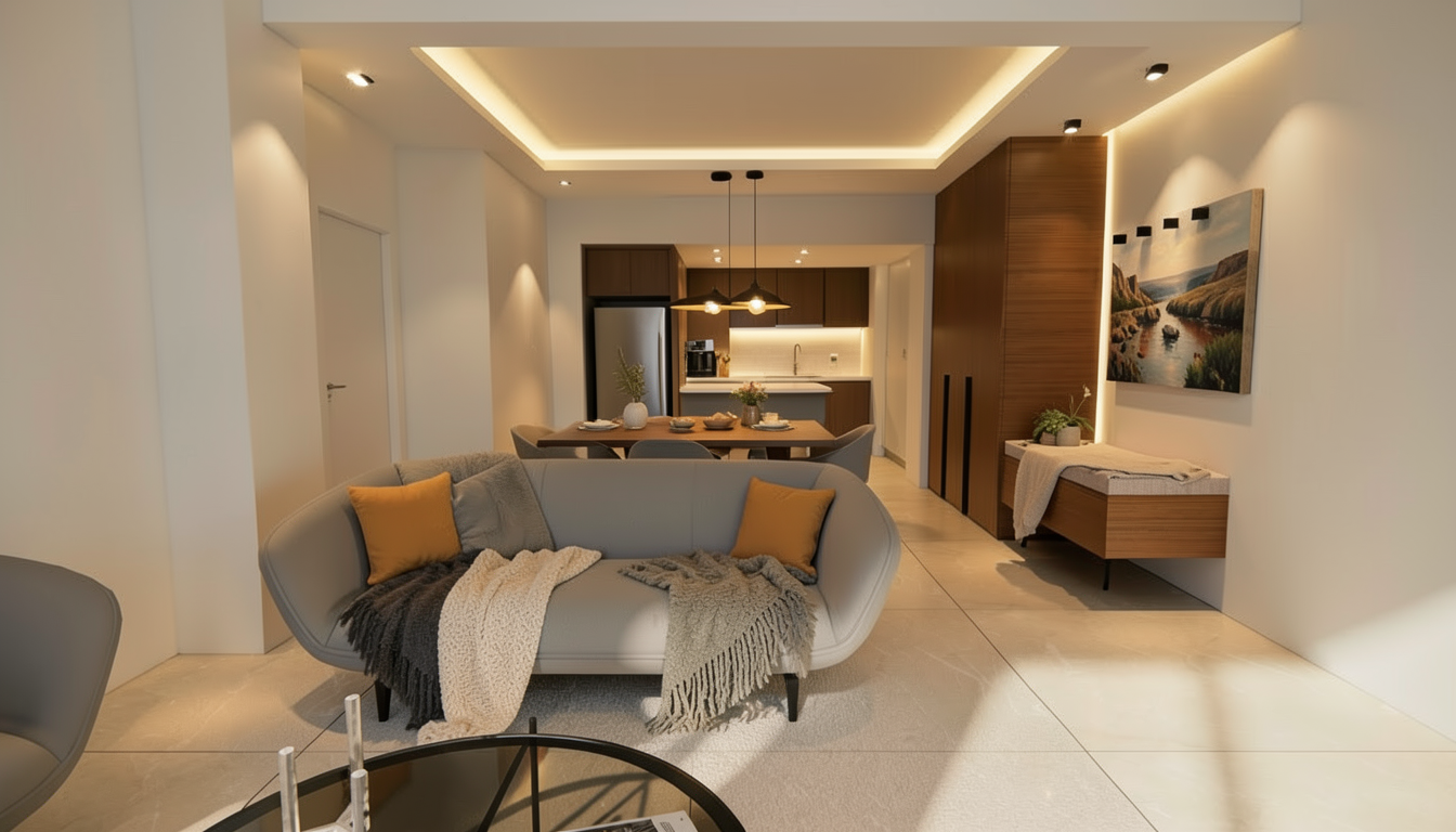 enhance the lighting to achieve a more realistic and natural result improve natural daylight quality brightness balance soft shadows reflections and global illumination to create a lifelike atmosphere increase realism through subtle light diffusion and accurate light behavior preserve all architectural elements materials layout furniture proportions and textures exactly as shown do not modify or redesign anything keep the blue marble exactly as it is do not alter its color tone texture veining or material appearance only enhance lighting realism and natural light quality while maintaining every original detail the floor beige