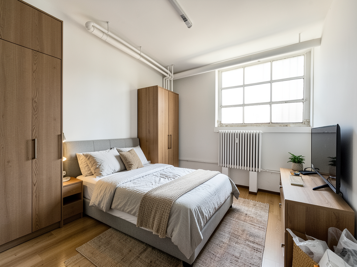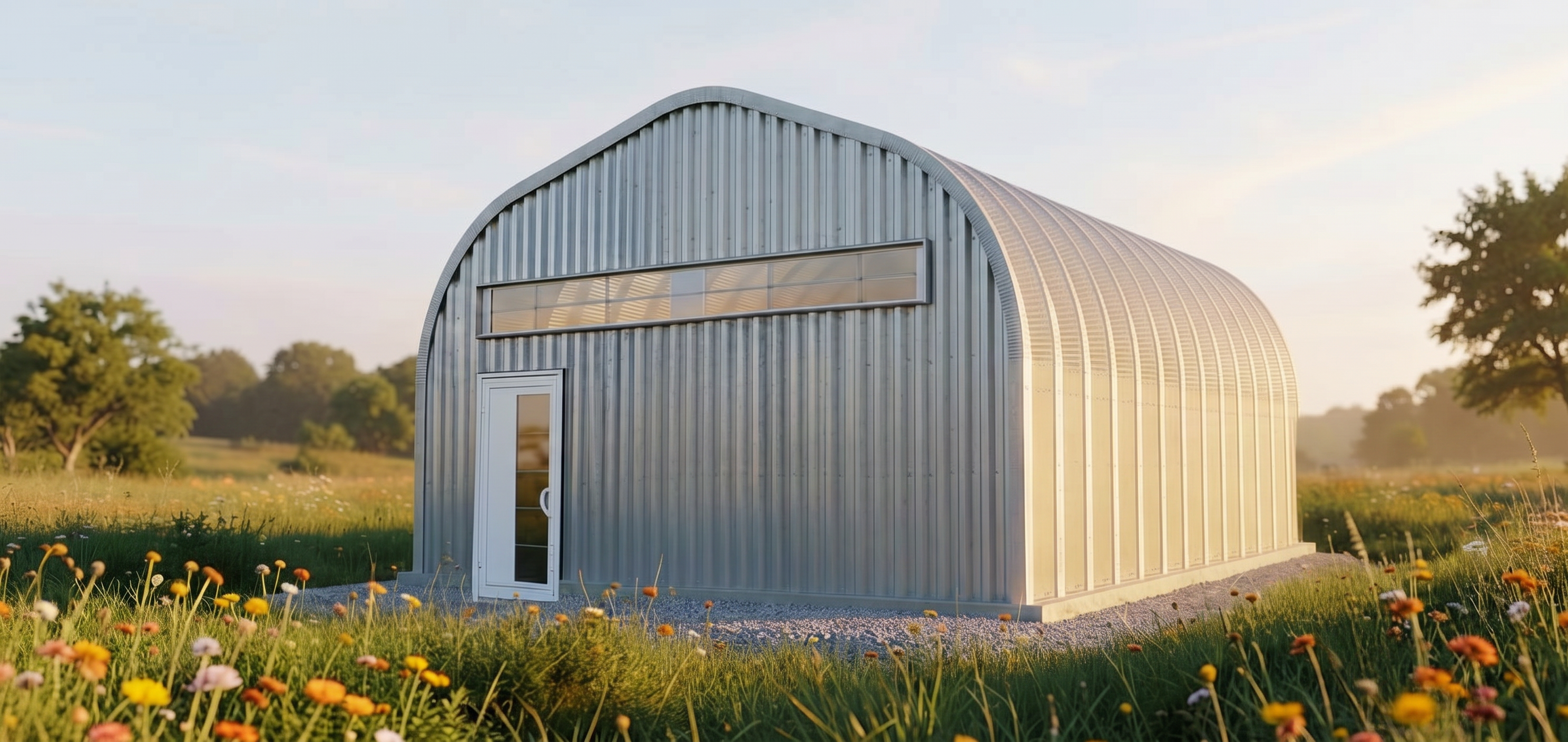 inside a metal building mechanic shop with white plastic covered insulation on the ceiling primer red steel metal building columns and beams along exterior walls vertical white metal on all walls brushed concrete flooring red and white dump trucks two mechanics in red tshirts and blue workpants working black stairs and railing industrial lighting glass and red garage doors with a gravel drive and limited landscaping beyond black windows with the office beyond