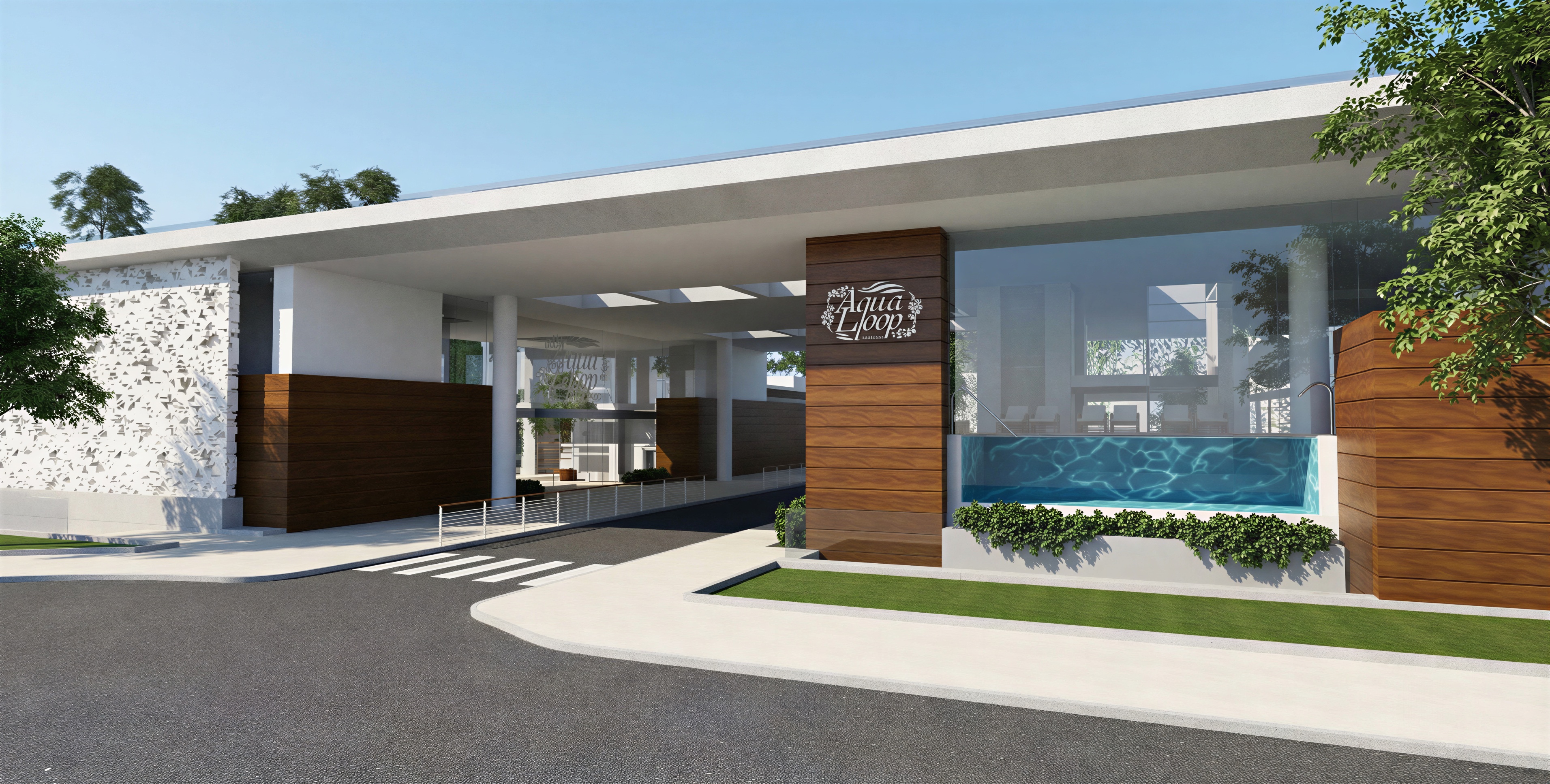 a new wellness center a woman swims completely underwater in the pool behind the glass a family with two children walks on the sidewalk others enter and exit through the main entrance