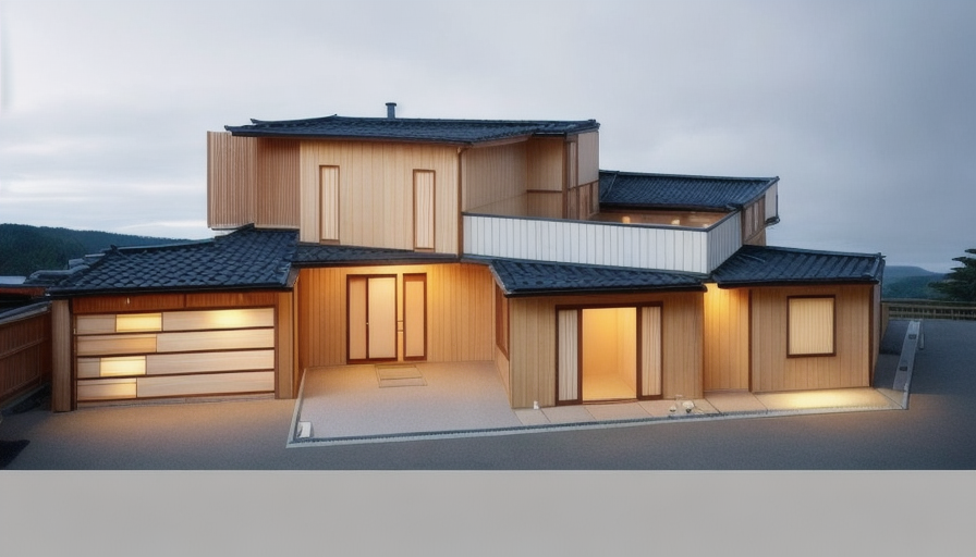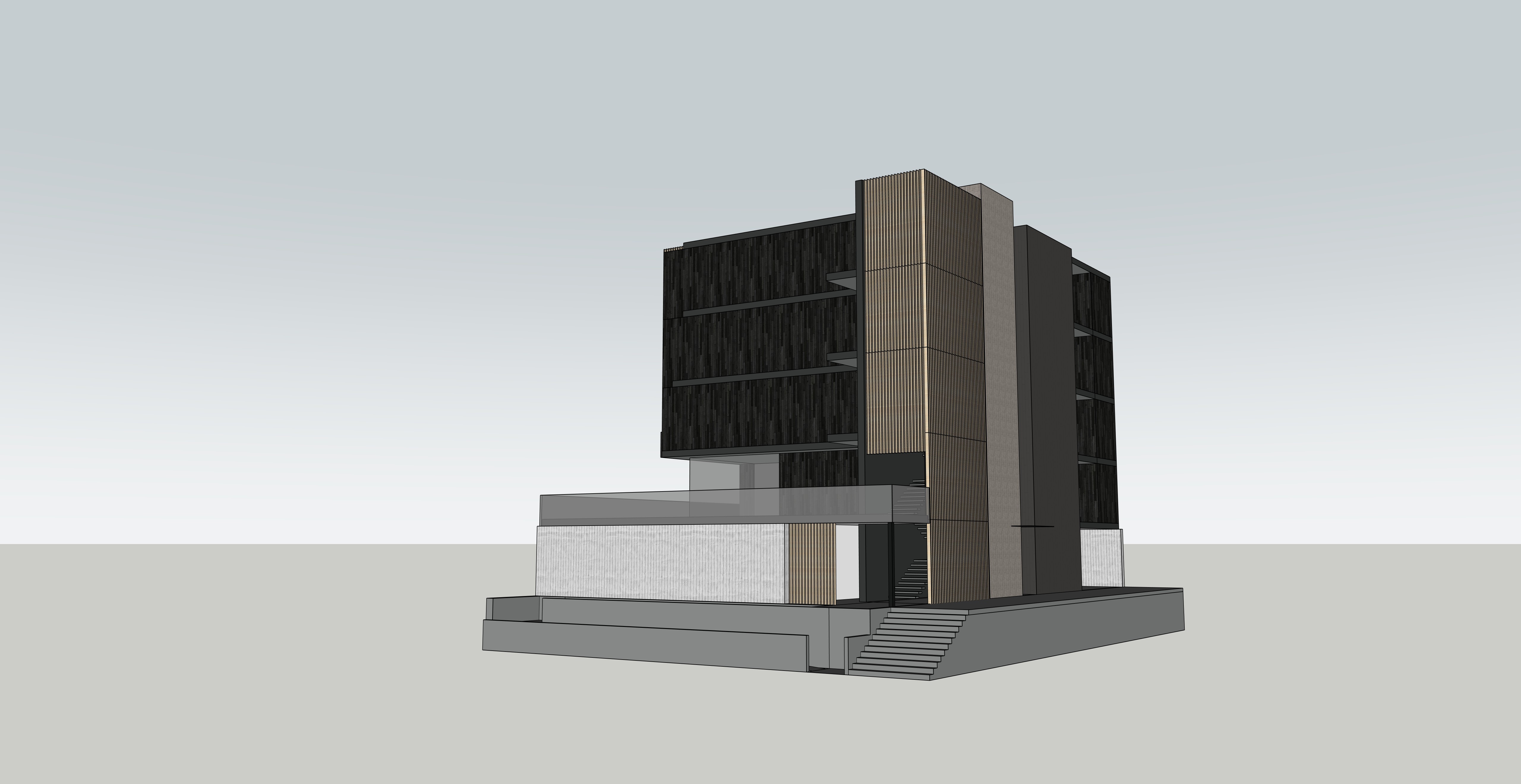 modern building with sleek architecture four stories high exterior walls are dark charcoal gray with black accents the central vertical panel has a wavy wood texture in rich walnut brown ground level is light gray with subtle concrete texture windows are large and tinted in deep blue reflecting a clear sky the surrounding environment is minimalist with a smooth pavement in soft gray the atmosphere is serene illuminated by warm soft sunlight casting gentle shadows