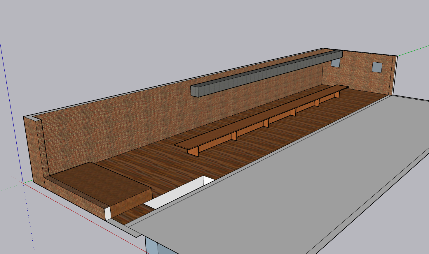render this as a banquet hall for a sports team in the center is a large table with seating for 75 people and above is a large light fixture i need a stage at the front i would like high back chairs around the table