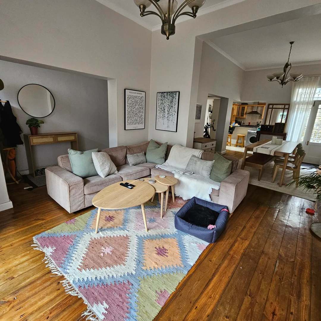 float this sofa in the space leaving plenty of room to manuever through the architecture swap the light fixtures for a modern danish light fixture and change the walls to a warm ivory color otherwise maintain all colors and patterns precisely just move the furniture