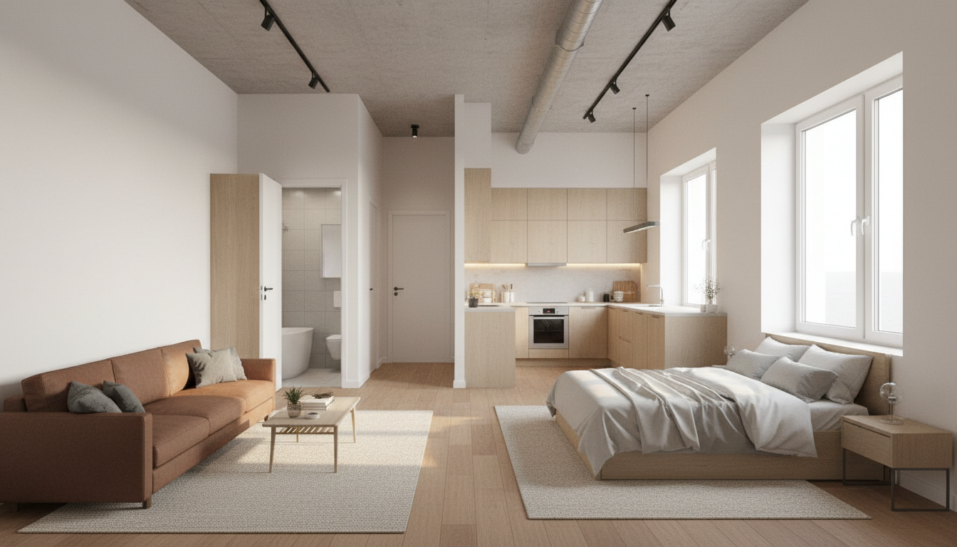 the attached render requires specific revisions please carefully follow the instructions below to ensure accuracy elements to keep exactly as they are no changes the bed the sofa in front including its rug and table floor and wall materials these are correct and must remain unchanged required changes 1 remove the windows behind the bed completely this area must become a solid wall with no openings 2 windows should not be visible in the render they are assumed to be located behind the camera viewer side only natural light entering the space should be visible from the front of the render not the windows themselves 3 add a full width wall side to side in front of the bed and sofa this wall must be continuous across the space it should include only one opening access doorway to enter the bedroom 4 on the right side before the bed add a wall segment this wall must be the same length as the bed it should include an industrial style artwork frame 5 after this wall segment leave an open door opening access void 6 then add a short white wall behind the sofa this wall and the previous wall must be aligned on the same plane 7 background view requirements from the opening the render should show the apartment entrance door a partial view of the kitchen behind it should also be visible please ensure proportions alignment and spatial relationships are consistent with the current layout looking forward to the updated render
