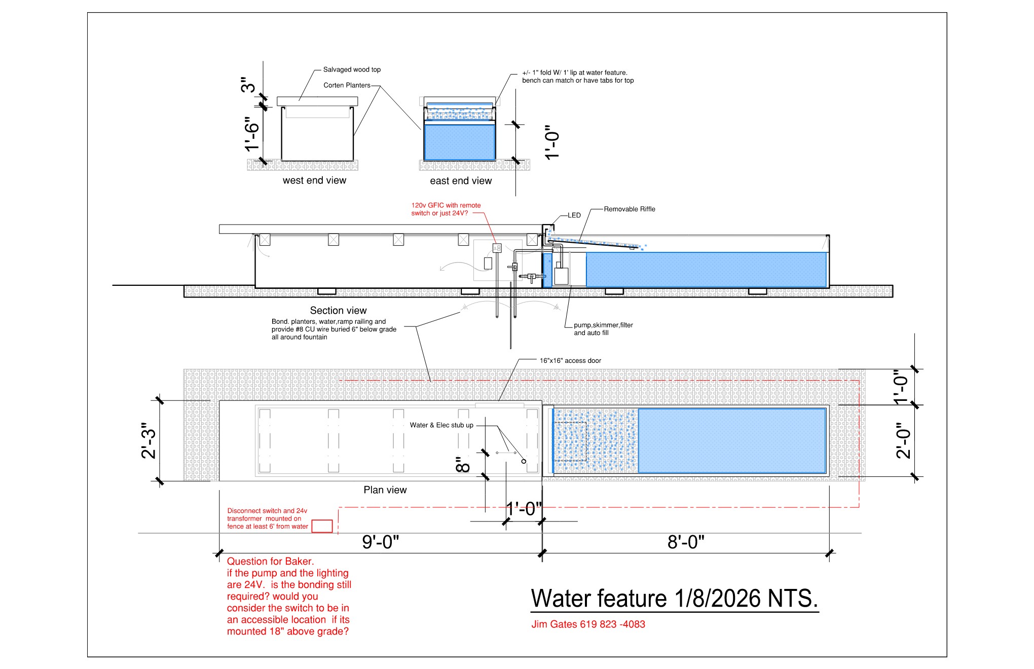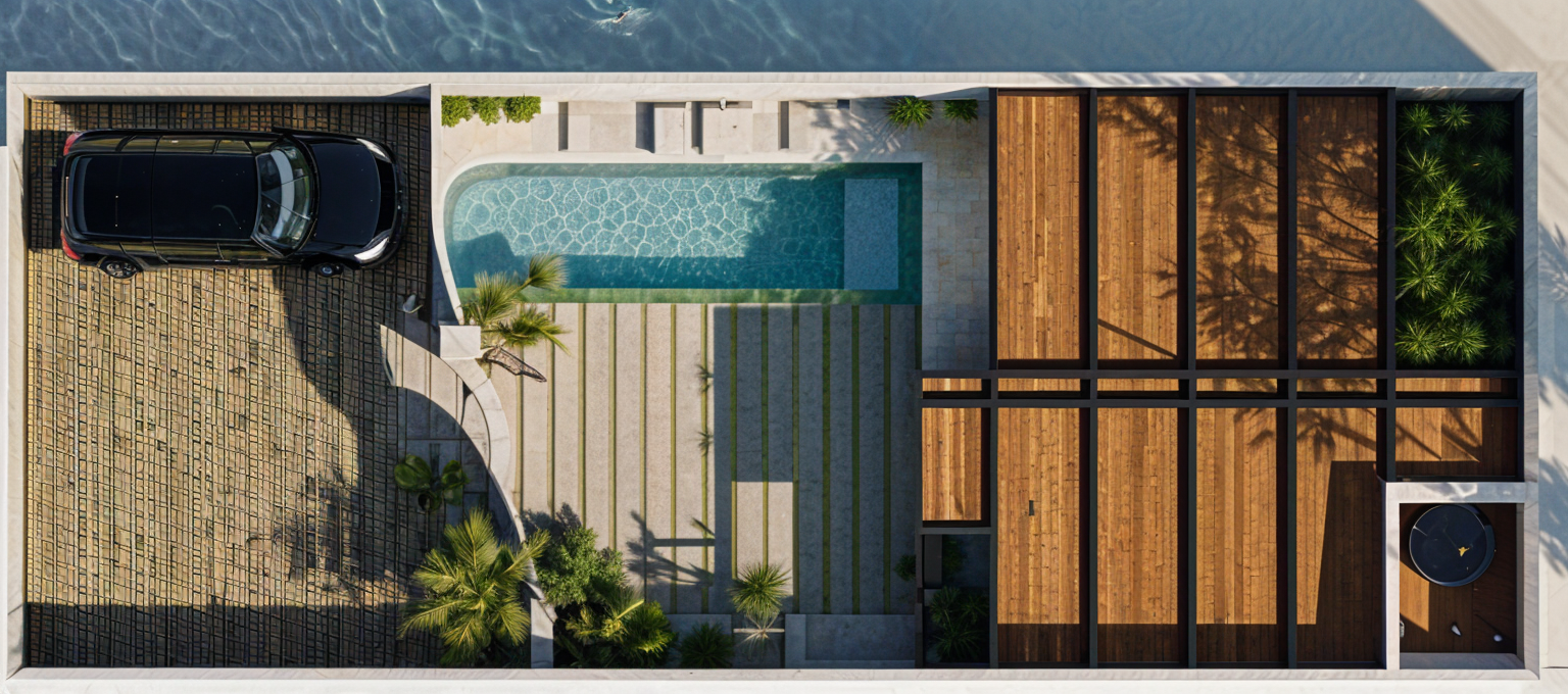 subject a clean architectural 3d visualization of a modern linear garden feature slightly stylized shaded view structure a long rectangular unit split into two sections left section a 9 foot long bench with a base of weathered orange brown corten steel topped with a thick textured slab of silver grey salvaged wood right section an attached 8 foot long corten steel trough filled with clear blue water a small metal spillway connects the bench to the water setting the unit sits on a tan decomposed granite courtyard the background is a lush garden filled with lemon and orange trees lighting bright natural daylight casting soft shadows style architectural concept art clean lines no text no labels 3d render style
