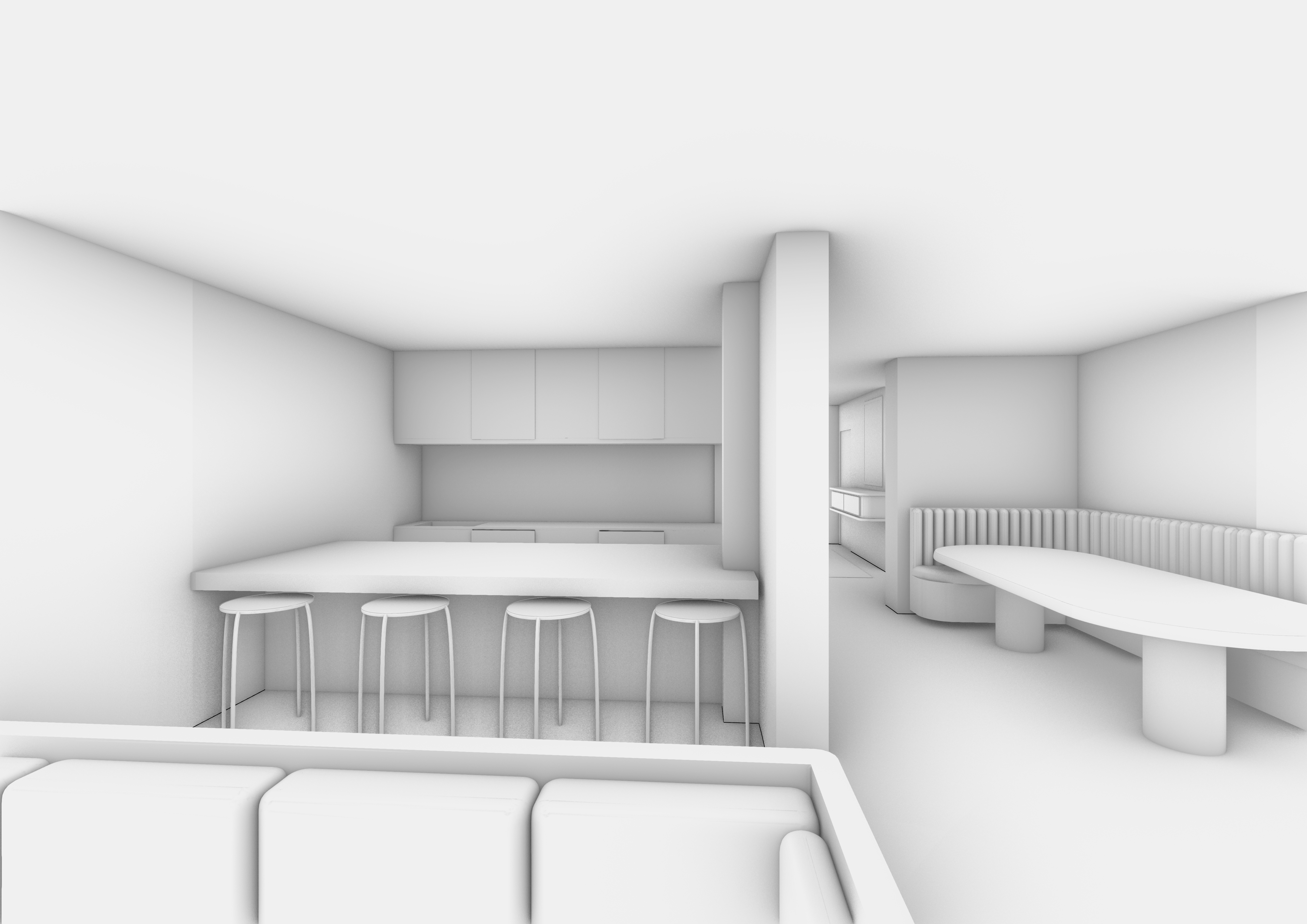 sustainable design perspective shot a bright and cozy living room bathed in natural daylight from large windows the interior is seen from eye level on the left side in the back there is an open kitchen fully fitted and equipped with built in appliances and quality materials the kitchen is located behind a sleek kitchen island or bar clearly set apart but still integrated into the open plan layout on the right side the living and dining area features neutral tone fabric sofas a wooden dining table and large wooden furniture mixing contemporary design with vintage elements the floor is made of warm wood the walls are white and a large area rug anchors the seating area decorative objects such as books vases plants and picture frames enrich the scene the ceiling is a white false ceiling with evenly spaced recessed lighting that provides soft ambient illumination across both the kitchen and living areas light curtains soften the windows in the background a hallway leads to the house entrance adding depth and perspective the overall ambiance is calm refined and welcoming the materials are natural and elegant the lighting is subtle but functional and the entire composition is thoughtfully designed with balanced proportions and realistic details photorealistic rendering with soft shadows no futuristic or surreal elements architecture
