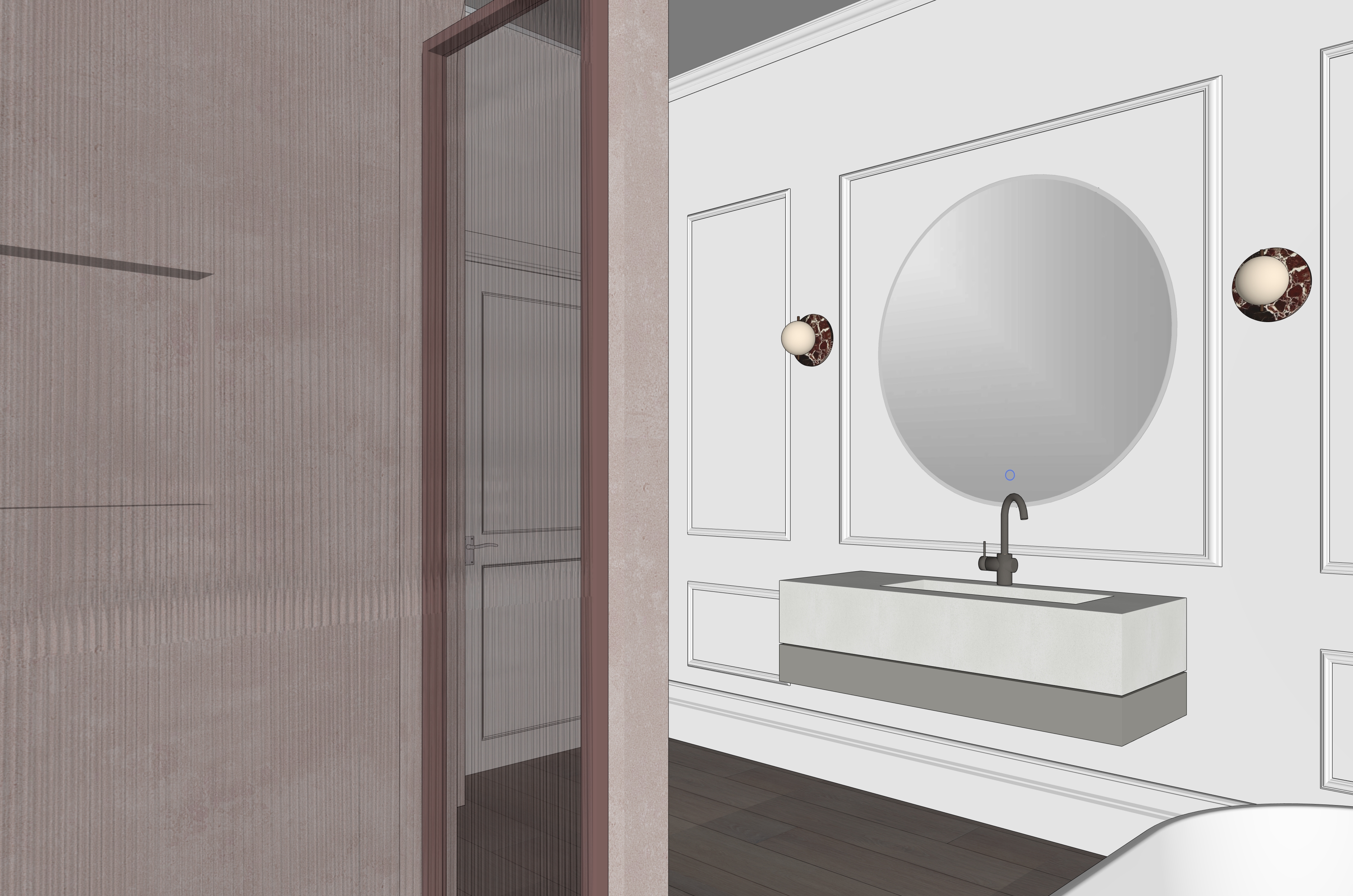 atmospheric evening view of bathroom large circular backlit mirror with two wall pink marble lights to each side walls are painted in quartz grey by dulux and are vinished in orac panels and moulding giving walls distinctive and elegant profiling decorative plaster on the shower enclosure is in champagne color shower screens are framed terracota color powedercoated frame floor is a wide plank reclaimed timber in natural shade the detail is minimal modern and elegant showing high end brassware by gessi and a geometric novello sink