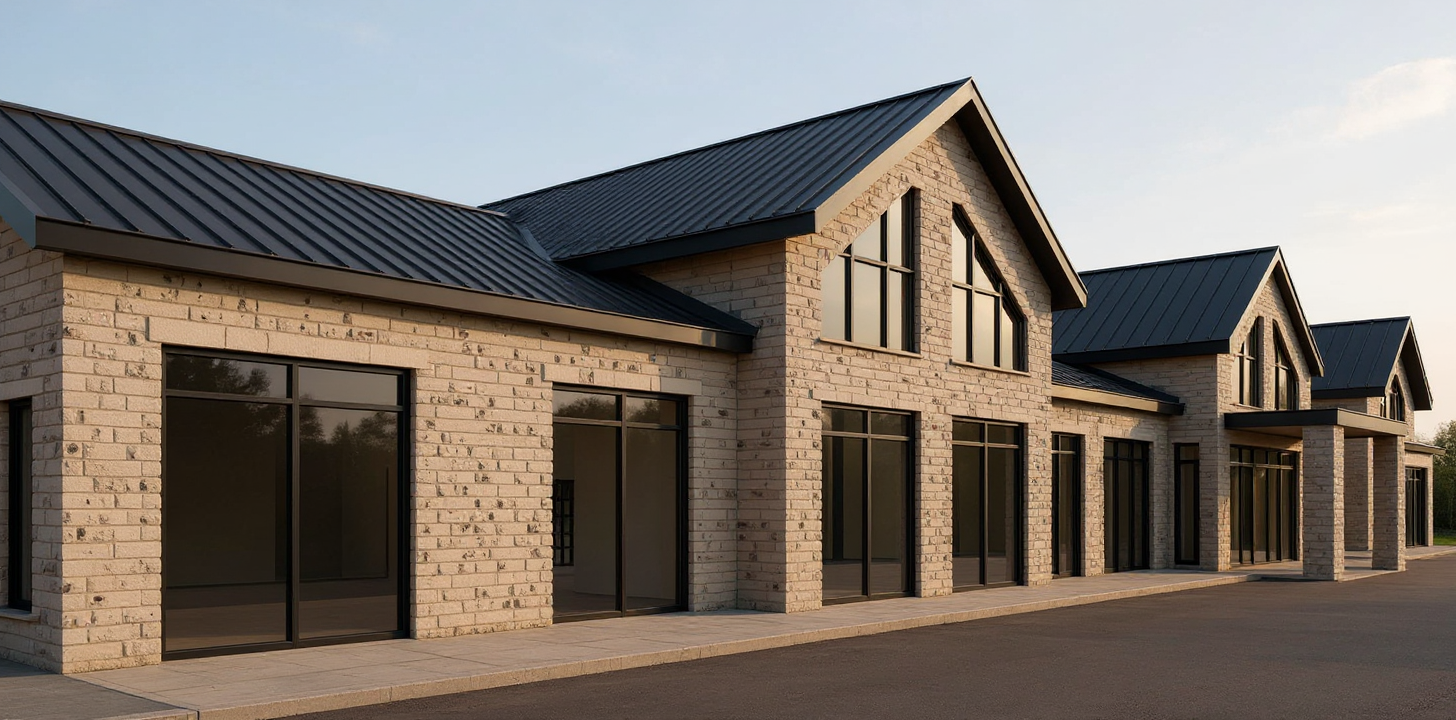 exterior shot render a modernist architectural building with sleek angular lines use a palette of light gray for the concrete deep charcoal for the window frames and reflective glass the building should stand in an urban landscape with a clear blue sky and warm sunlight to create a bright and inviting atmosphere add subtle shadows for depth and dimension highlighting the building s geometric design architecture