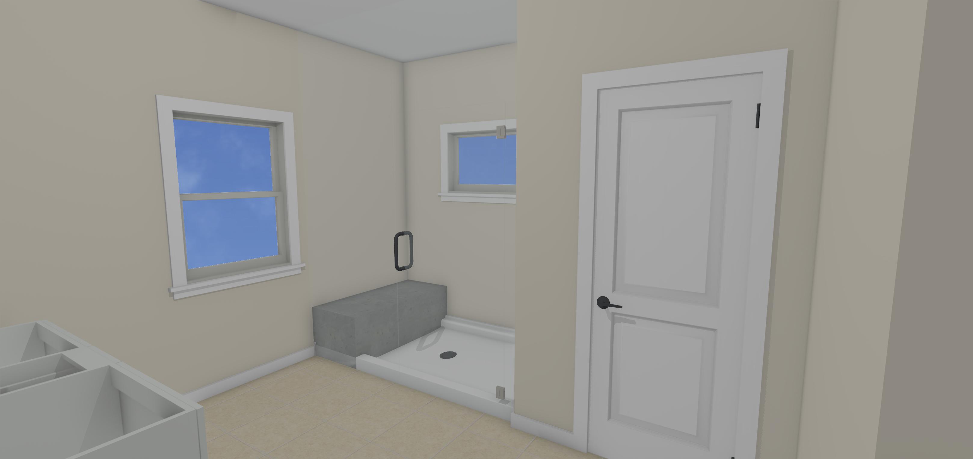 double vanity on the right tiled shower with bench and ada grab bars