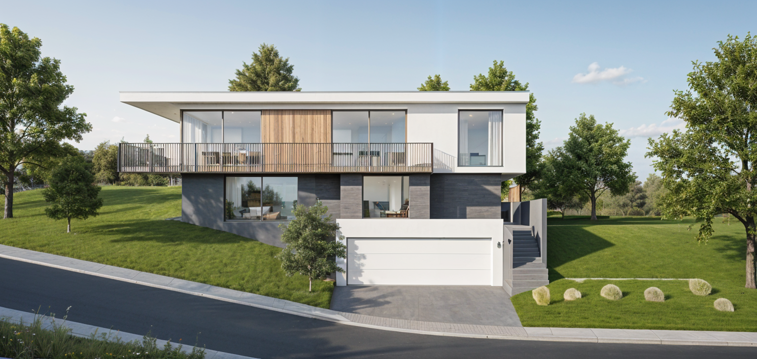 zaha hadid exterior shot render this with white vinyl siding and white windows with a black shingle roof and white exterior columns garage door and exterior trim architecture