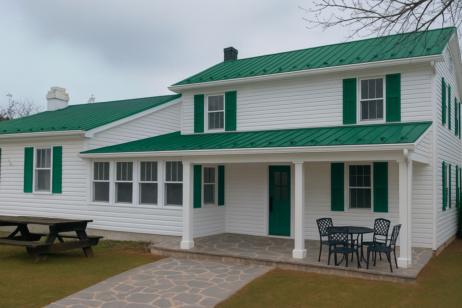 please keep everything as is in this image but correct the following all four side by side windows to left of the door plus the single window to the right of the 4 windows should be 12 inches longer at the base and all the same length these are the only windows on the first floor to change their size to make taller the entry door should be a natural amber wood stain and its size should be about 8 inches wider to the left the color of all the roof sections should be silver and all shutters should be black the columns and siding should be kept white as s the patio should extend out further into the foreground and extend patio out more to the left to where the four side by side windows meet that left roofline to the far left addition