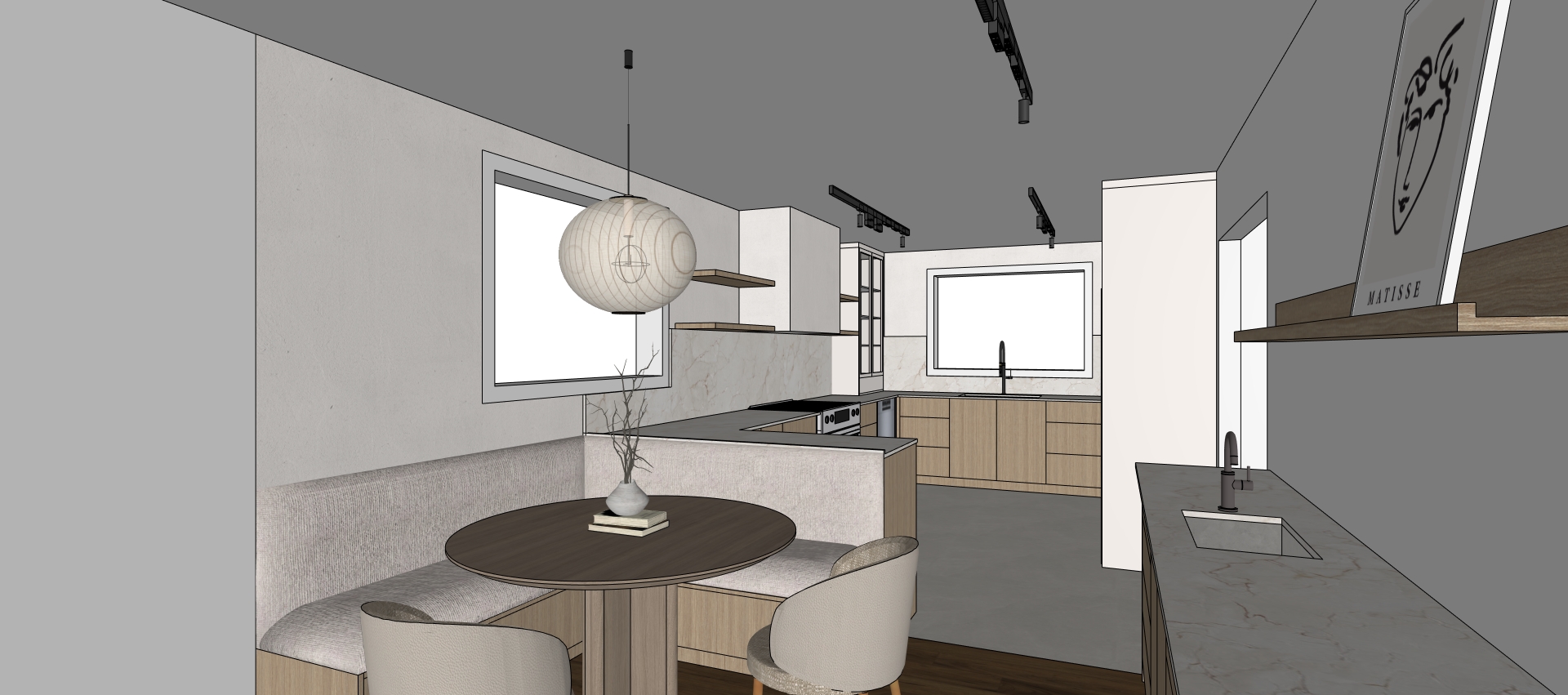 render this japandi style kitchen by adding realistic materials lighting and decorations maintain the structure layout dimension and design of this kitchen walls and insert hood are off white plaster floating shelves and base cabinets are natural oak matte upper and tall cabinets are off white painted mdf with sheen level 50 glass cabinet has frosted glass add shelf lightings glass cabinet lightings add modern roman shade in the window in natural linen add minimal decorations like stacked plates and cook book in japandi style add a coffee machine and mugs where the mini sink with filtered water faucet are