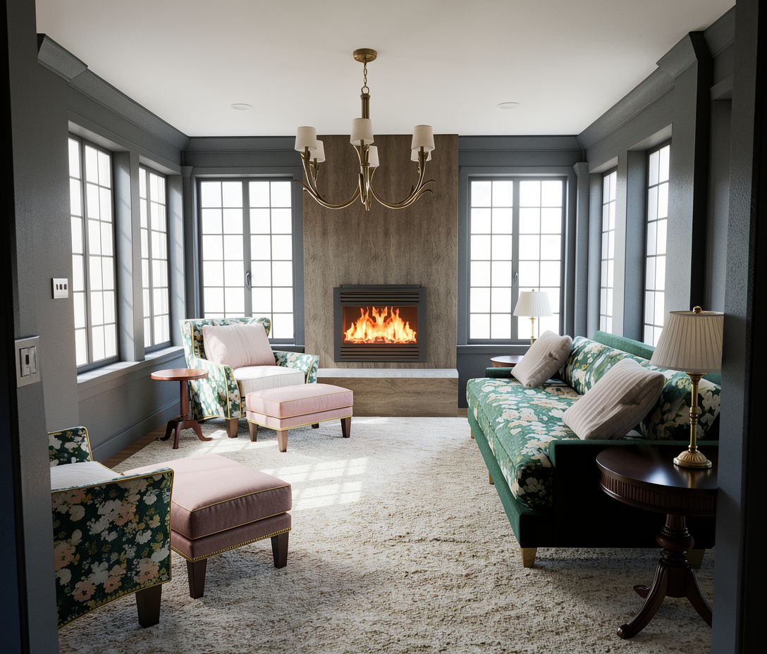 create a serene and luxurious bathroom scene based on the given layout the room dimensions are narrow approximately 11 x 6 design a modern japanese scandinavian bathroom from the pov of the entry on the right is the toilet followed by a minimalist walnut wood floating vanity with a sink sunk into it on either side of the mirror and handblown glass light fixtures in front of the viewer on the back wall is a fully enclosed shower area a dark green tiled spa steam shower the doors to the shower slide and seal to hold in steam on the left opposite the vanity include a dark brown stone freestanding oval bathtub on the left that sits directly on the floor include two small windows on the left above the tub that allow direct sunlight in use a color palette of neutral tones charcoal wood stone for a zen calming effect with matte brass fixtures the atmosphere should be peaceful and spa like inviting relaxation and tranquility no plants add dark walnut herringbone flooring