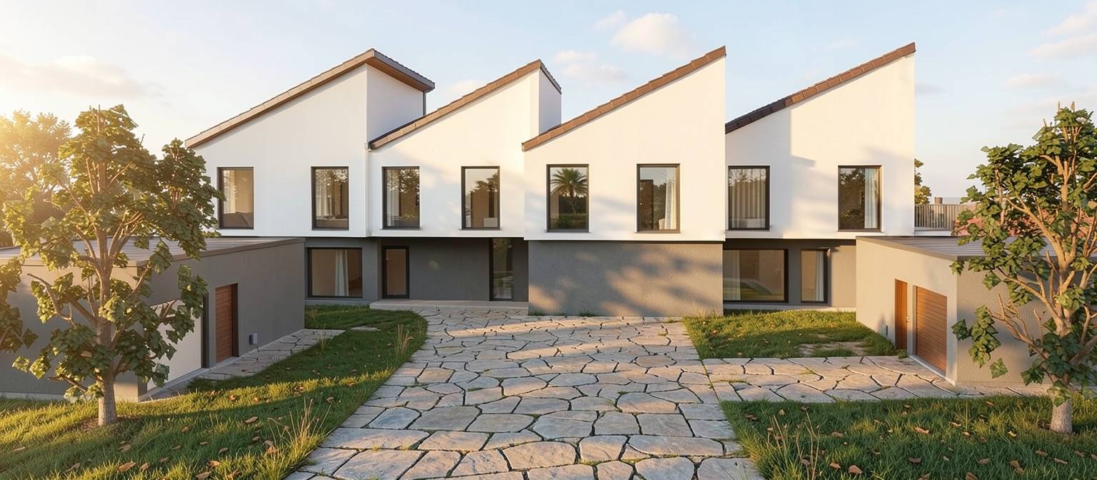 add stone path on the ground the garage doors on the two separate objects is white color