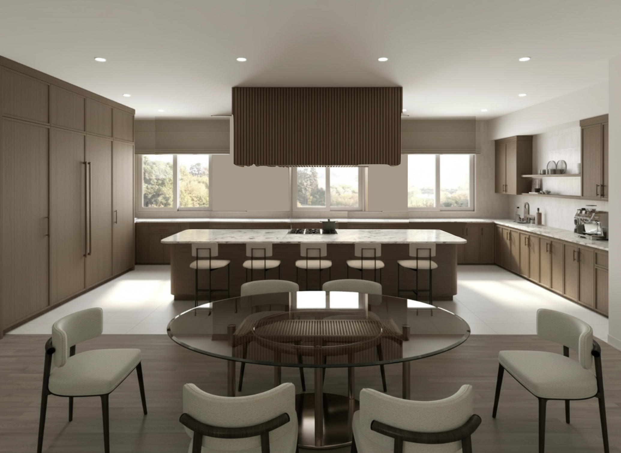 clad vent hood in plaster remove floating shelves on the right wall and replace with matching upper cabinets