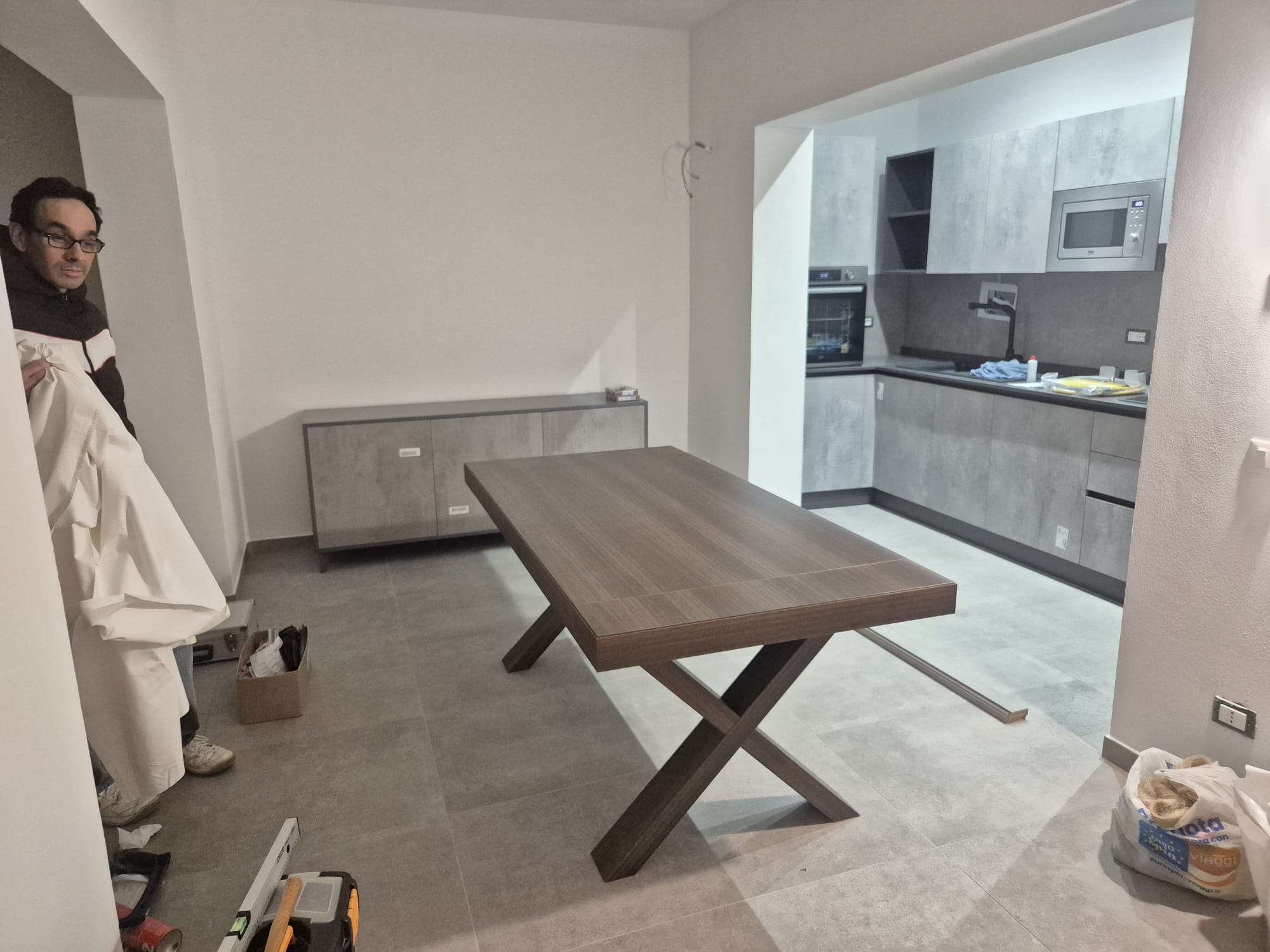 metti 8 sedie di legno stesso legno del tavolo ma di tiologia squadrata moderna attorno al tavolo