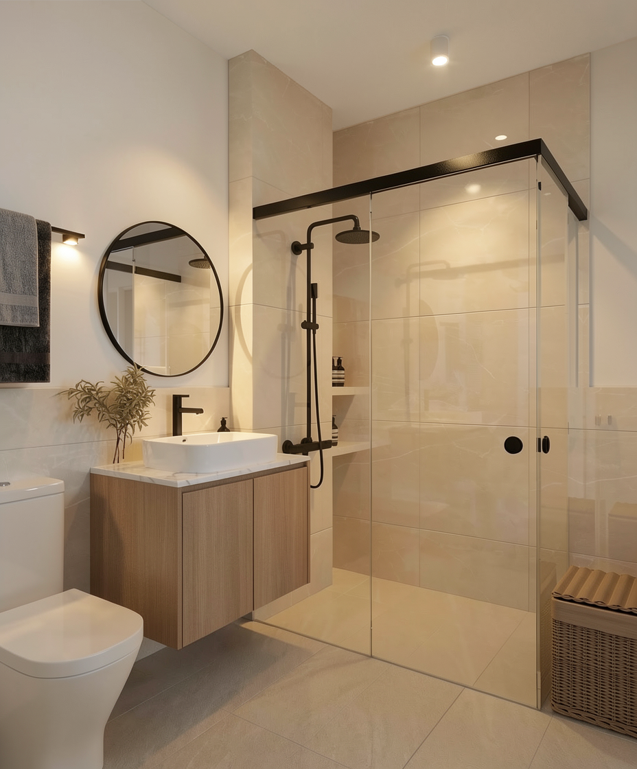 preserve original geometry keep layout unchanged no redesign no new furniture enhance only lighting and materials follow the drawing exactly preserve all wall positions and room proportions exactly no modification to design and materials do not change any materials or colors change black bathroom accessories into chrome silver