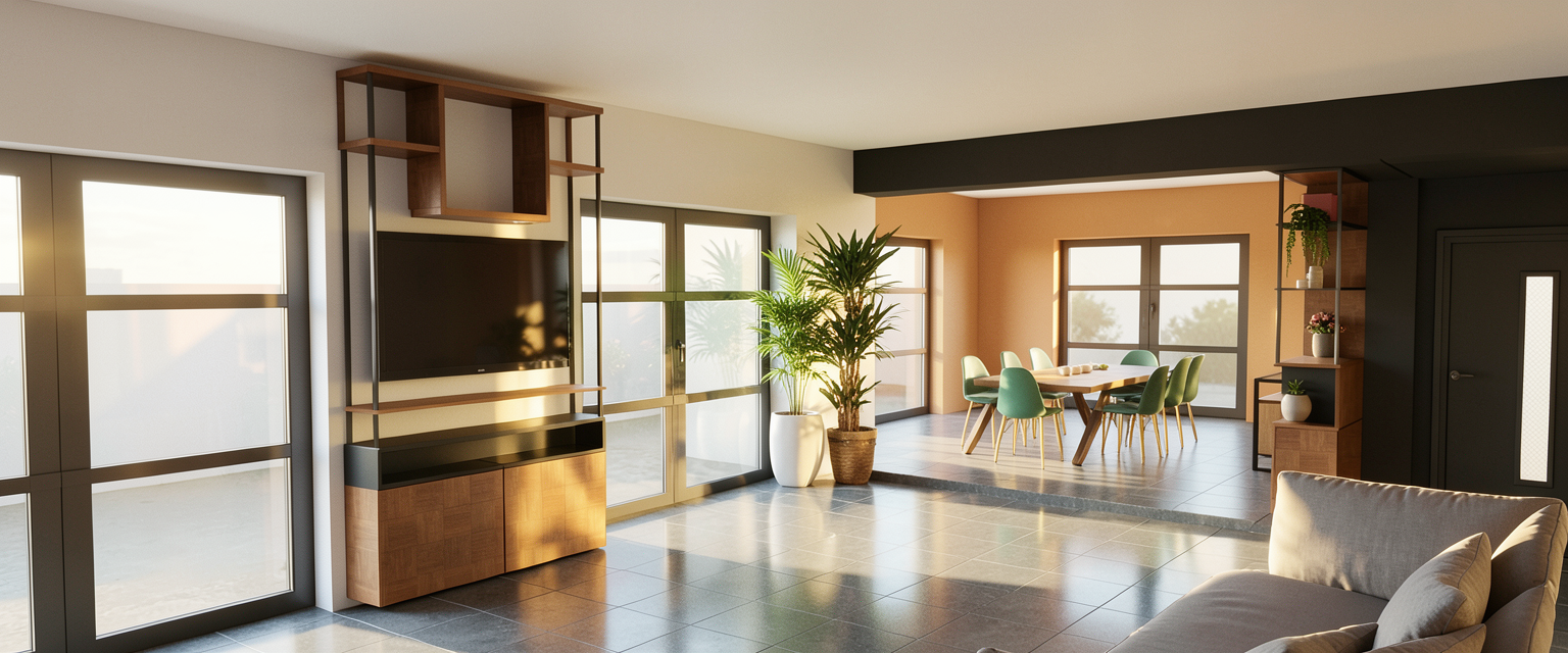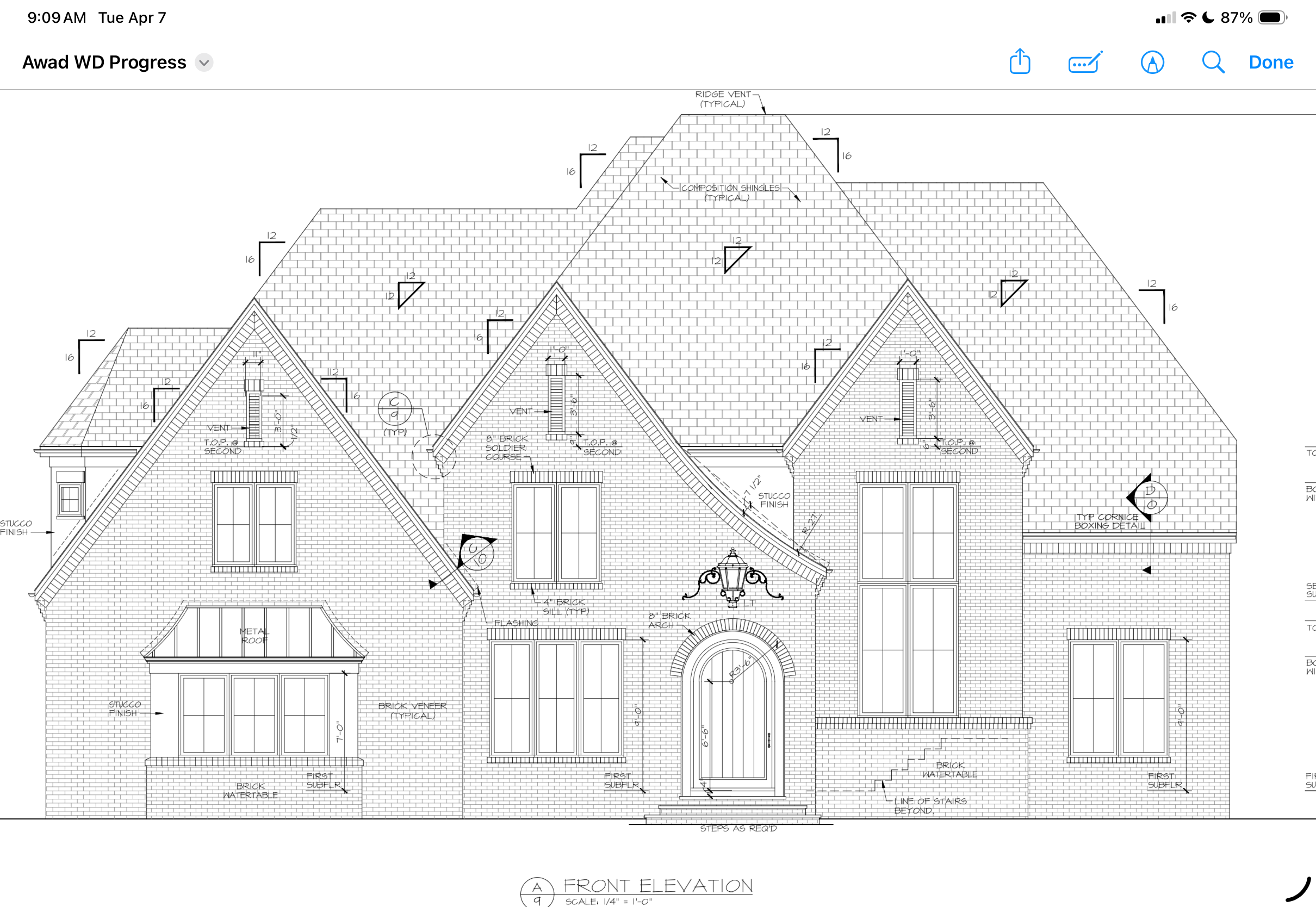 render photo realistic english country style black windows black roof light beige brick lush landscaping vibrant blue sky keep all details ignore all notes on drawing