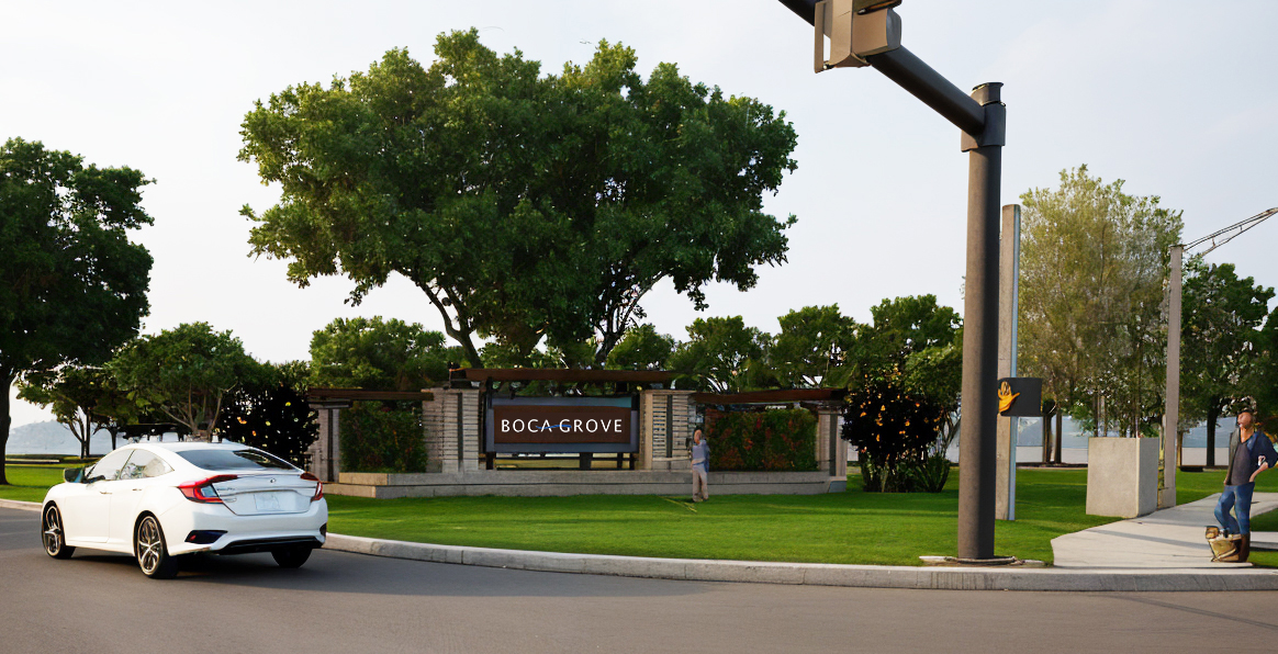 community entrance monumental sign recangular tile on peirs to be stack modern no natural stone south florida low limited mixed ground cover afternoon sky lighting front area to remain as lawn