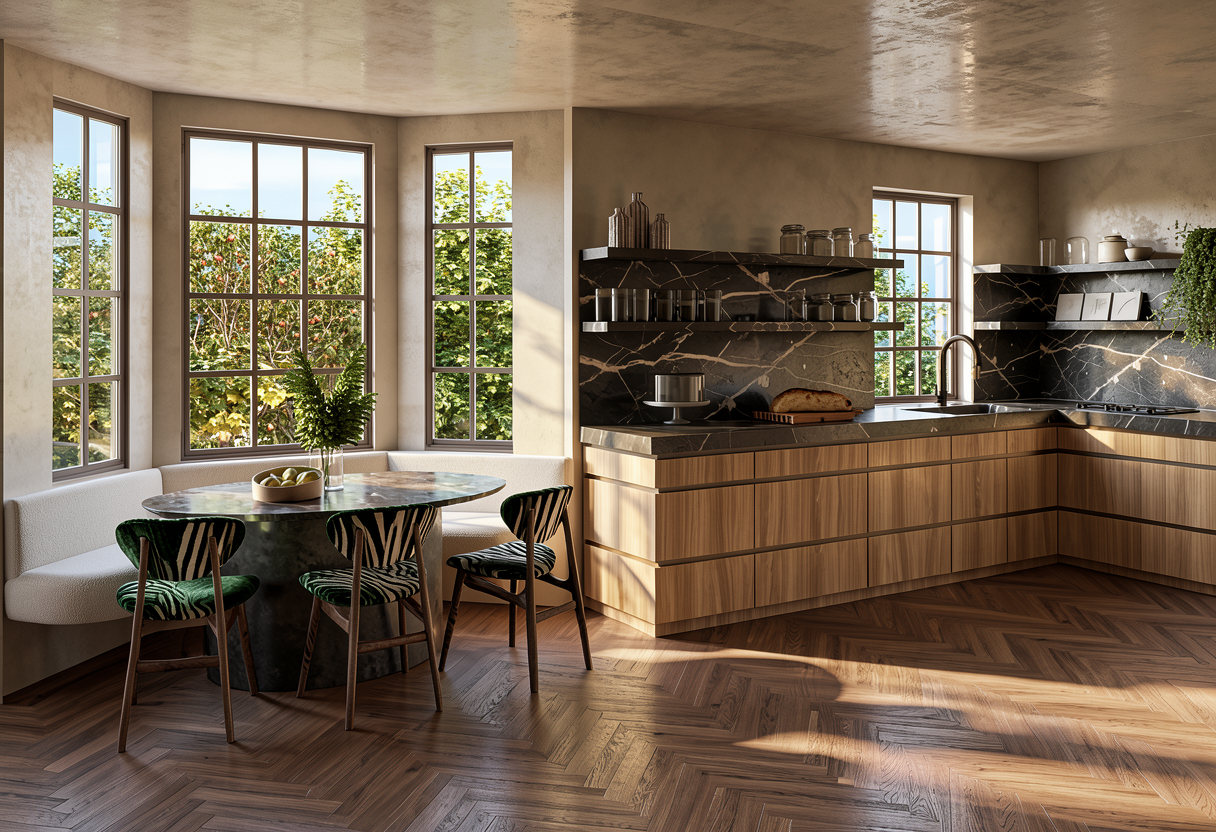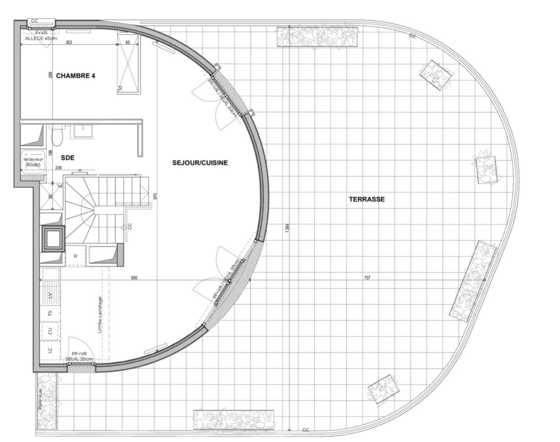 convert this floor plan into a realistic isometric 3d view of a full house show the space from an elevated angle with furniture walls and details visible global flooring living areas circulation polished waxed concrete floors throughout all main living spaces palette warm beige grey tones smooth matte finish with subtle light reflections seamless transitions between rooms bathroom sdb master suite grade italian walk in shower with frameless floor to ceiling glass panel rainfall ceiling showerhead freestanding sculptural bathtub organic form matte stone finish double sink vanity with stone countertop wall mounted faucets integrated under mirror lighting floor walls large format beige porcelain stoneware tiles honed finish tight grout lines mediterranean warmth with contemporary precision dressing room full perimeter built in closets flush panel doors floor to ceiling height integrated handles open central circulation axis warm beige lacquered or natural wood finish coherent with the global mediterranean palette home office bureau dedicated working office setup structured desk with integrated computer workstation ergonomic layout built in shelving or cabinetry ambient and task lighting layered materials echoing waxed concrete and warm wood tones of the main spaces wc laundry room interior living dining open kitchen flooring seamless waxed concrete throughout warm beige grey tone matte polished finish no transitions between zones the flooring flows continuously from entry through living dining and kitchen areas living area low profile mediterranean seating deep linen or boucl sofas in warm sand tones aged brass or travertine coffee table subtle arched architectural details echoing the curved fa ade geometry ambient layered lighting recessed ceiling spots pendant warm light over dining dining area large raw stone or solid wood dining table 8 10 seats statement pendant lighting cluster above aged brass or woven rattan shades positioned to face the curved glazed wall and terrace view open kitchen with central island fully open kitchen integrated into the living space central island oversized waterfall edge in honed marble or concrete warm beige veining flush induction cooktop on island integrated seating on one side bar stools leather or linen kitchen cabinetry floor to ceiling flat panel doors matte greige lacquer or natural oak finish integrated appliances no visible handles stone or quartz backsplash continuous with countertop material exterior panoramic terrace 100m flooring large format stone effect porcelain pavers warm sand travertine tone continuous grid layout echoing the plan s tile pattern flush with interior threshold 20cm seuil noted on plan respected layout zones on terrace lounge transat zone to the right arc of the terrace daybed transats in weatherproof linen low side tables in teak or stone surrounded by planted mediterranean beds olive trees lavender grasses as seen in plan corners dining bbq zone rear center of terrace built in outdoor kitchen with integrated stainless barbecue stone countertop prep area long outdoor dining table in teak or concrete 8 seats parasol or retractable pergola above bar zone left wing of terrace arc freestanding or built in outdoor bar stone top bar stools integrated wine beverage cooler warm pendant lighting strung above landscaping perimeter planted beds with mediterranean species as indicated on plan stone or corten steel planters at terrace corners soft evening lighting floor uplighters string lights under pergola integrated step lighting use the same furniture as shows on the plan do not change the orientation of the floorplan