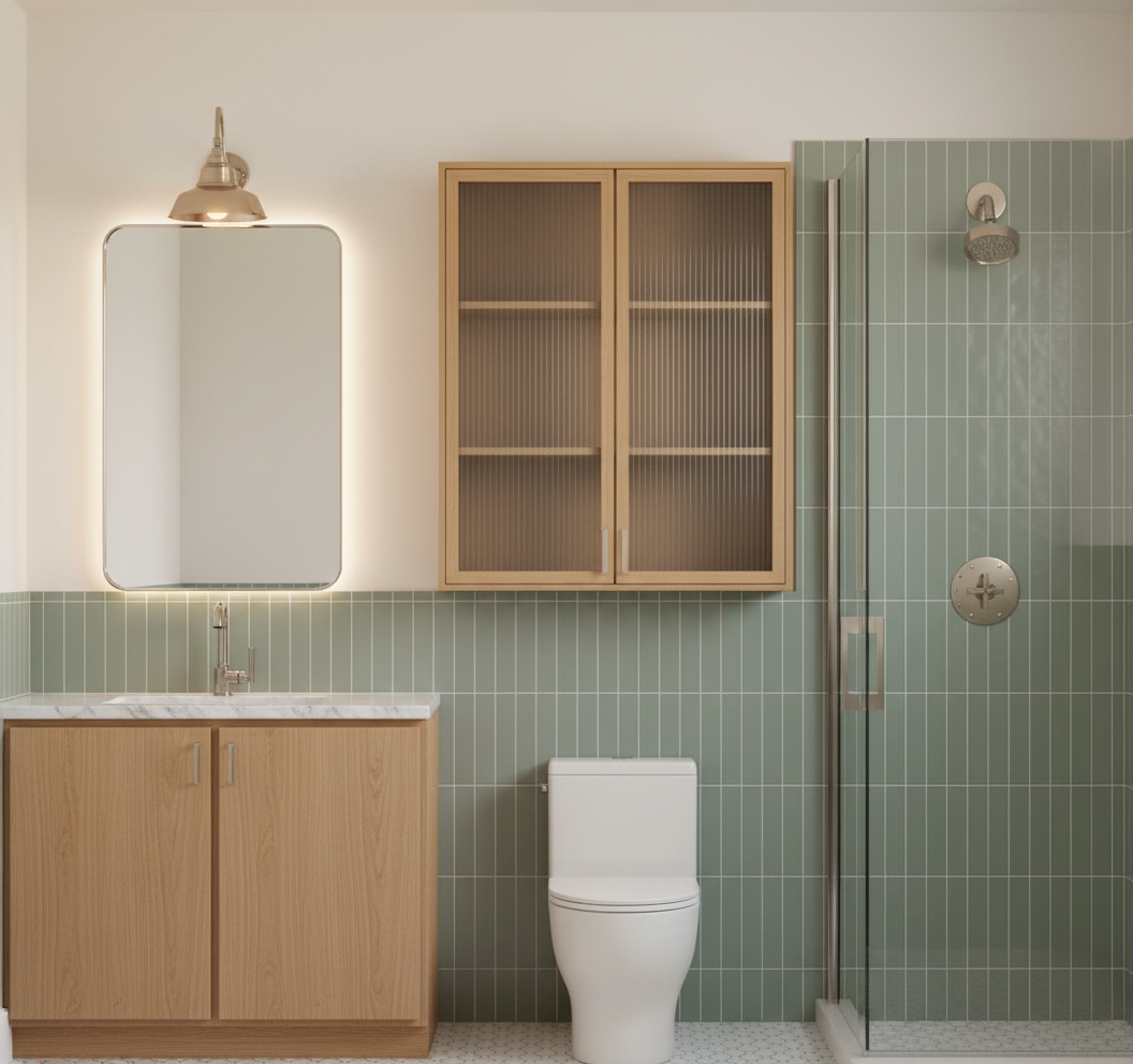 add a small glass vase with green plant on vanity show white towels neatly rolled inside glass cabinet