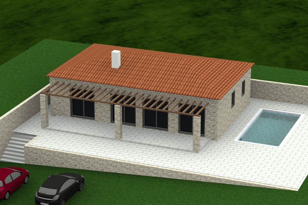 the same house without the roof tiles but with concrete slab and wall 0 60 m from stone