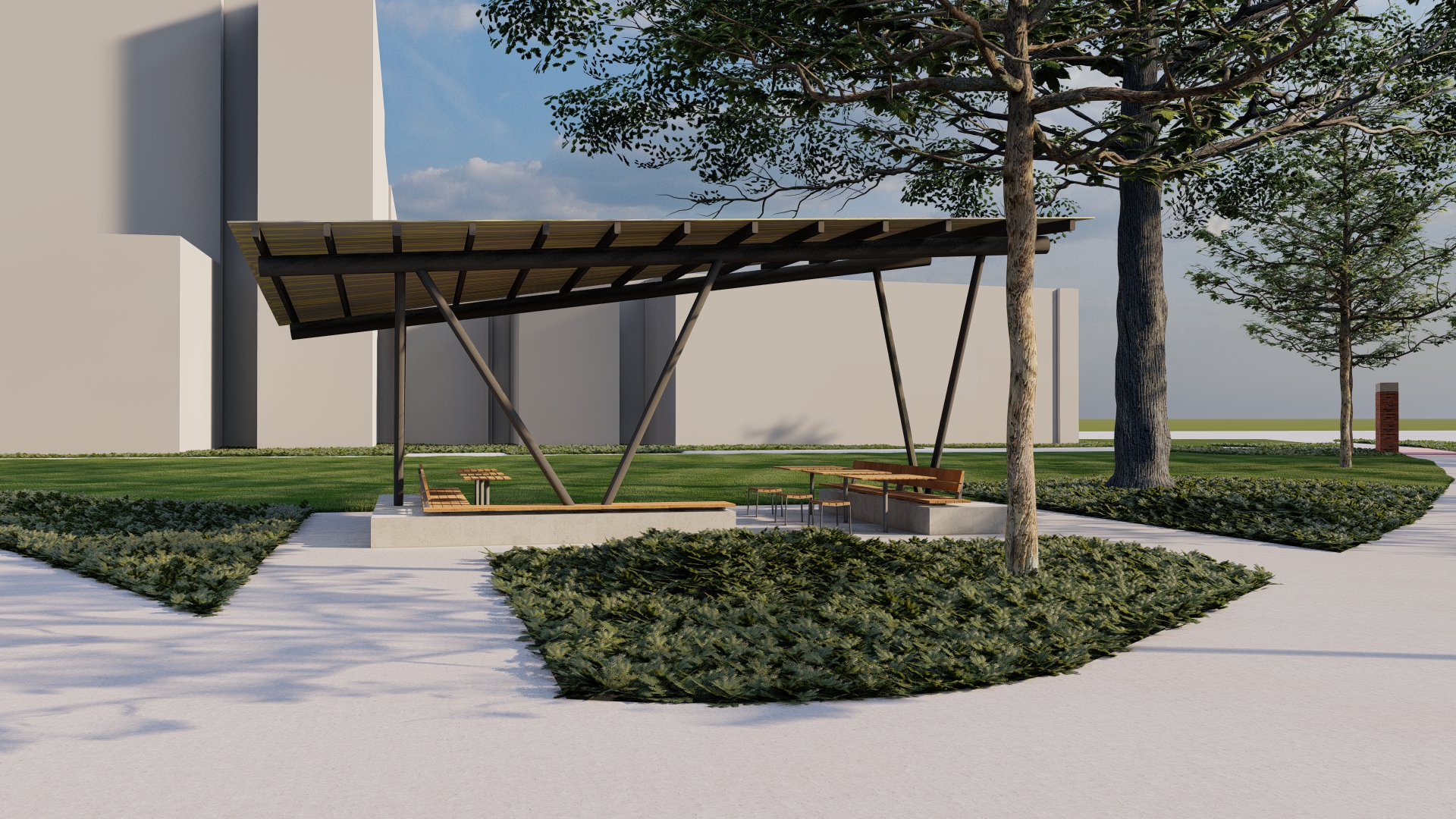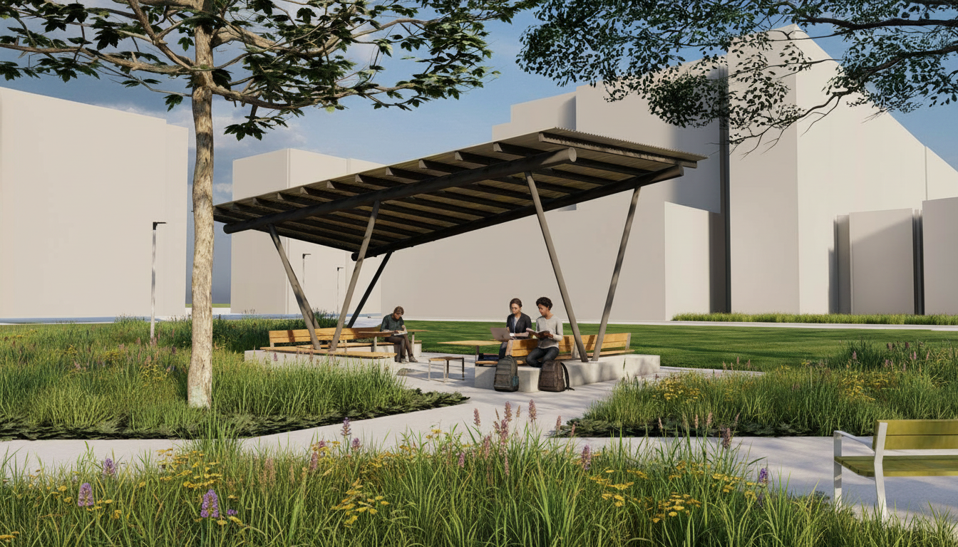 leave background as is show students studying underneath pavilion show plant beds as native iowa short grass prairie show university of iowa students walking on sidewalks in foreground