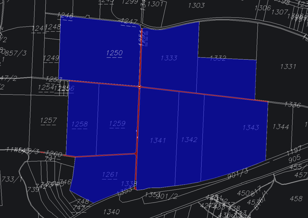 the blue area is 57 2 hectares the red areas are municipal roads that are to be preserved on parcel 1341 the clubhouse with parking spaces is to be constructed in the area of the paths a par 72 18 hole course is to be designed additionally a driving range with a length of 240 meters and a width of 100 meters is to be built near the clubhouse the final result should be presented in a bird s eye view floor plan