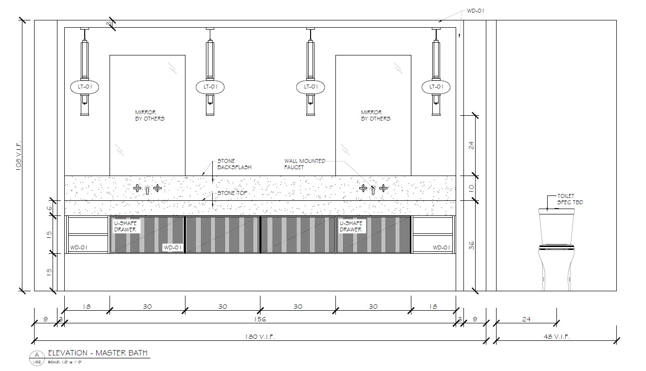 reeded door style floating cabinet in natural walnut with 6 white countertop and integrated sinks suspended lighting polished nickel wall mounted faucet architecture