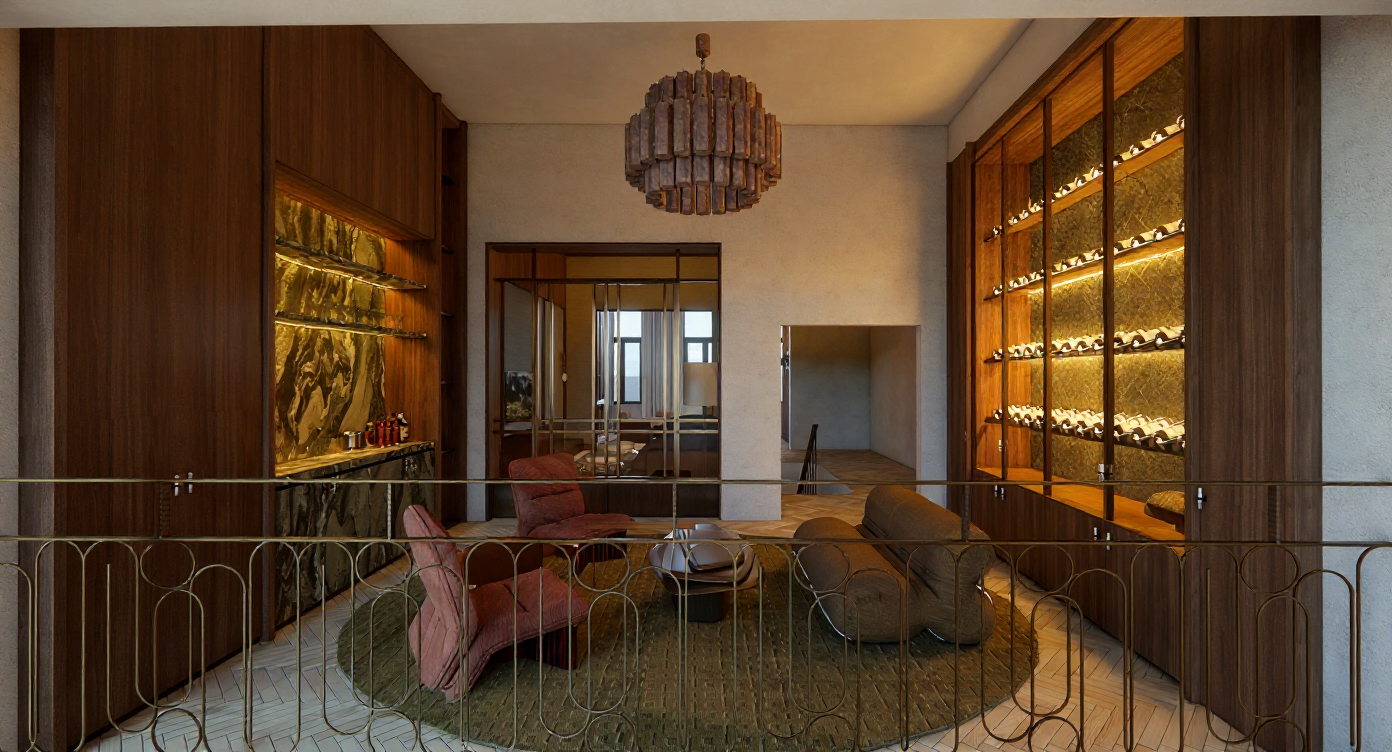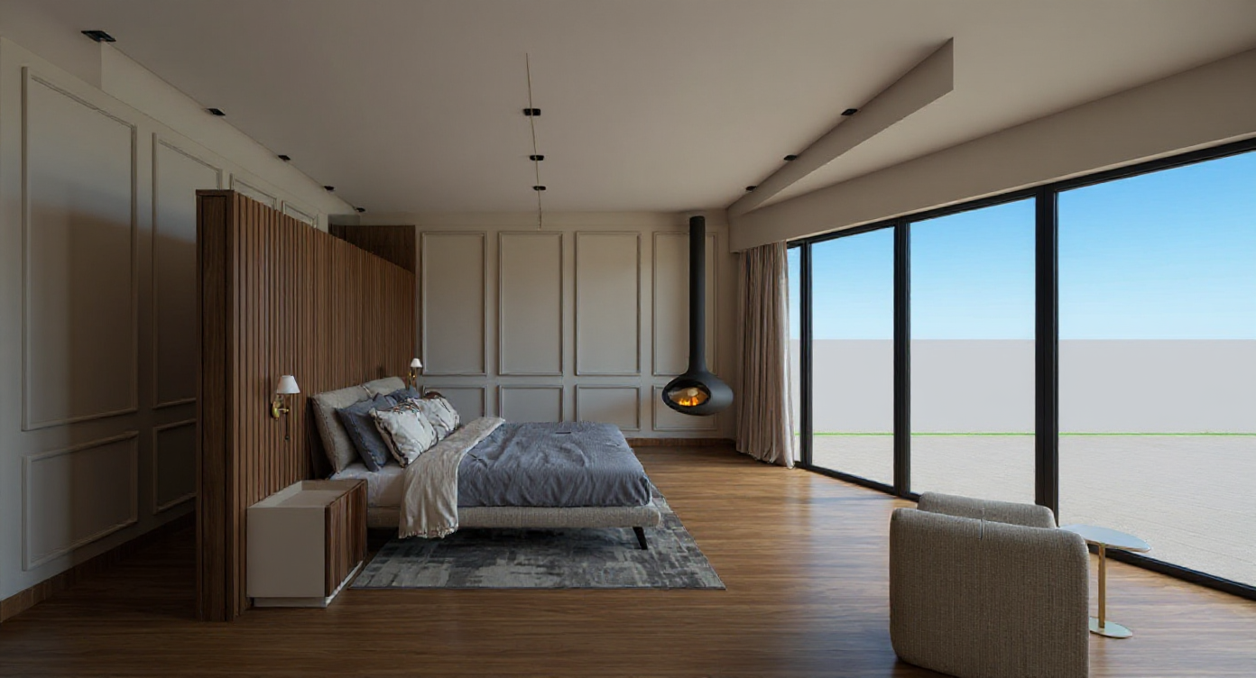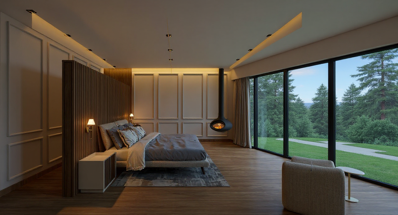 add residential trees outside the window it should be like the trees youd find in mexico city on the cieling behinf the fireplace there is running led lighs as illumination the squares on the cielieng are led lights make them wark the lines going through the black squares are just illumination dont add the lines in the final image the roof is completley flat the bedroom is on a second story of a house
