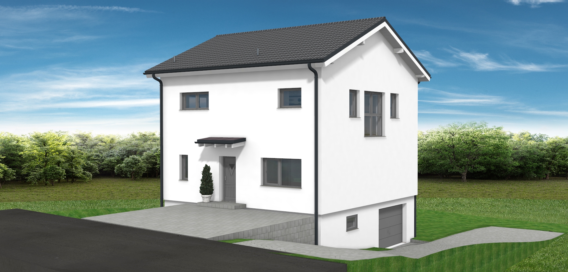 bitte erstelle f r exakt dieses haus eine realistische au enansicht behalte bitte alle parameter und ma e des hauses bei dachziegel anthrazit fenster und t ren hellgrau fassade wei eingangs berdachung bitte mit blechbahnen in anthrazit darstellen das haus soll bitte in einem elegant dezentem aber modern gestalteten garten situiert sein im vordergrund des hauses befindet sich eine stra e parkfl che vorm hauseingang