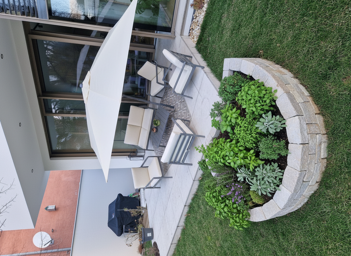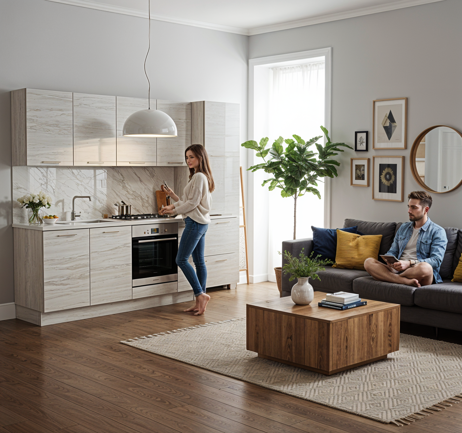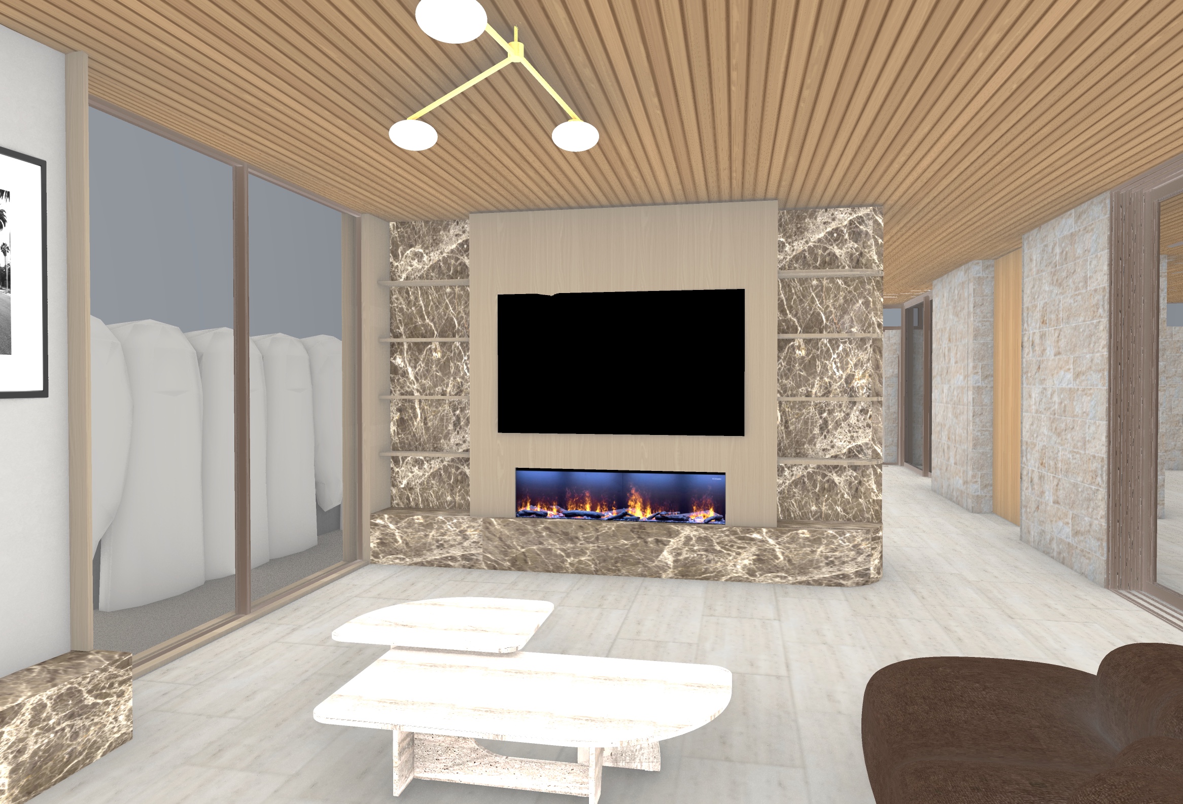 transform into a high end hyper realistic visualisation keep the view the same same walls same window do not make floors shiny matte cream stone floors add detailed textures and reflections add large textured cream rug under coffee table add tall shrubs outside window on left side no grass low afternoon sun