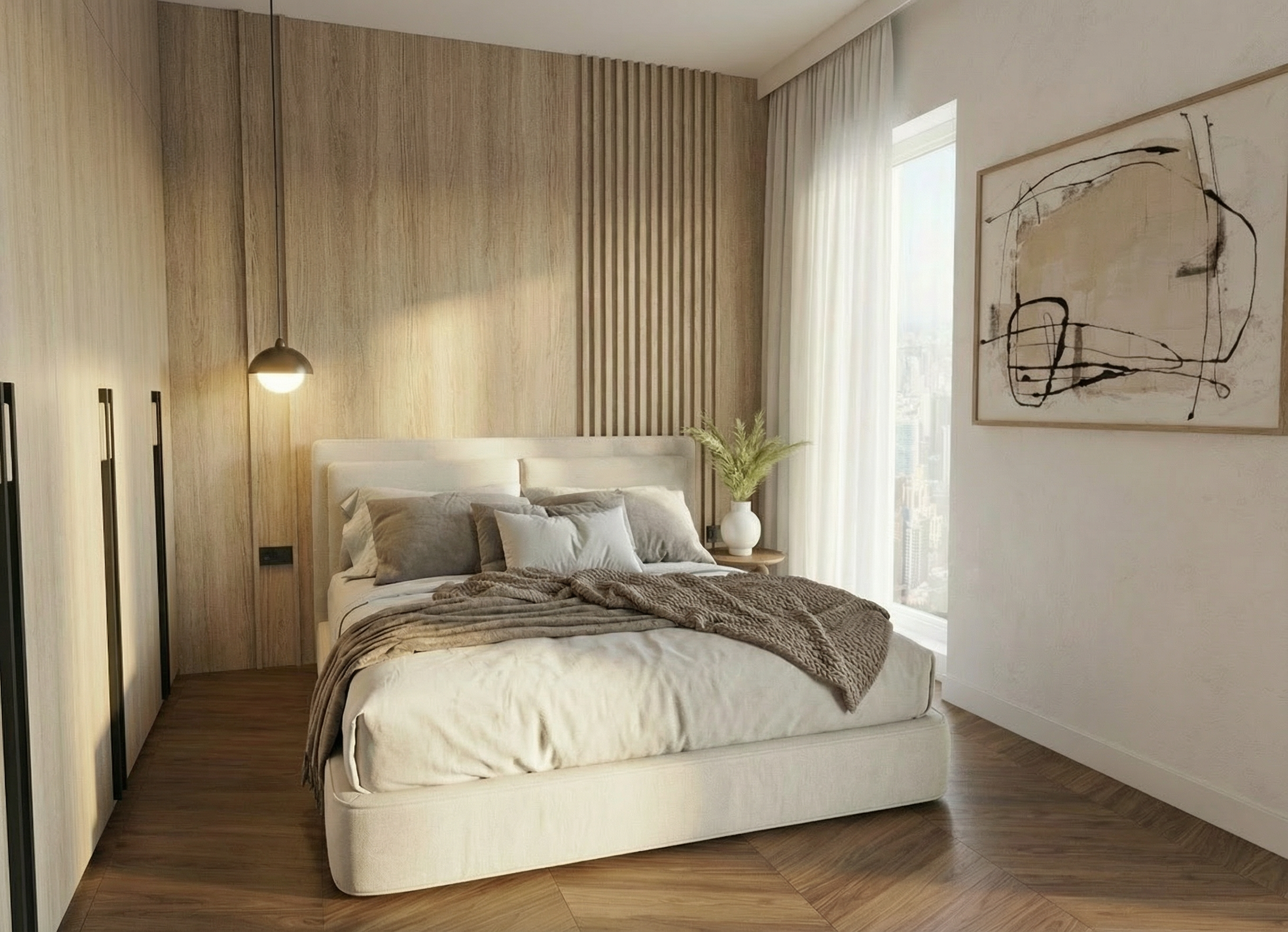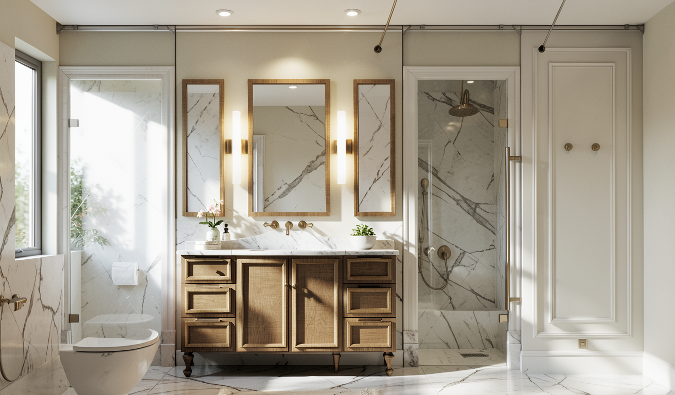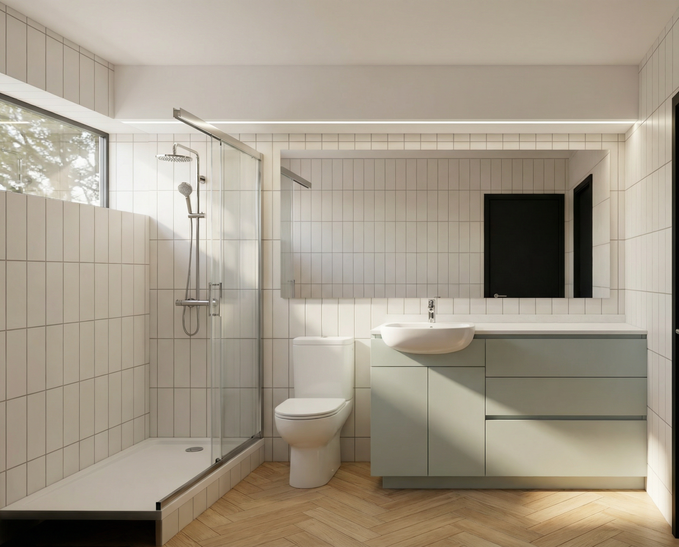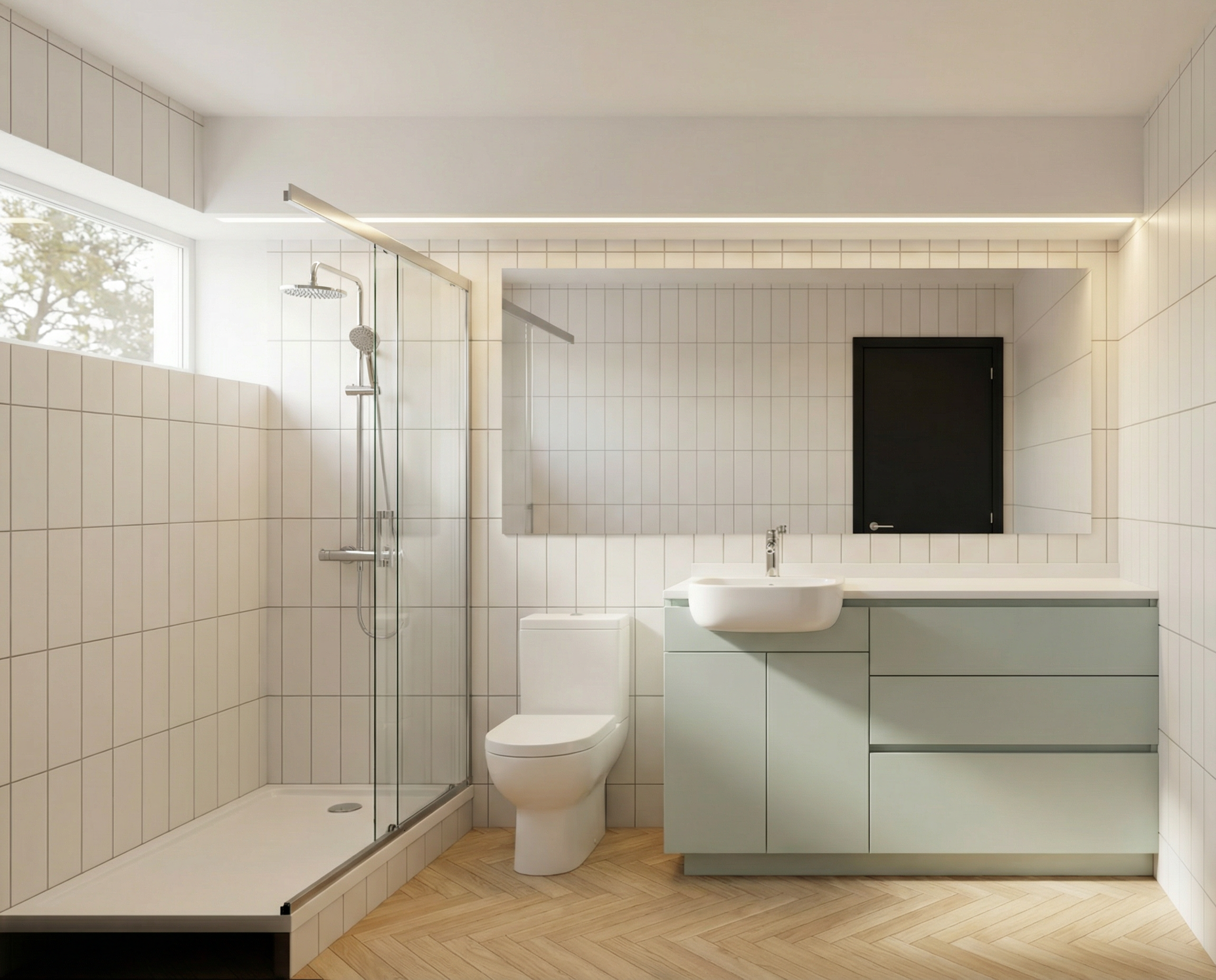 interior rendering instructions bathroom mantain the geometry of the image light colored wooden parquet flooring laid in a 45 degree herringbone pattern matte white ceramic wall tiles 30 10 cm installed vertically white countertop bathroom vanity made of glacier green melamine place avanity basin on the left side of the cabinet with a chrome plated steel faucet place a standard wc between the vanity cabinet and the shower area modify the existing shower tray geometry bottom left and replace it with a white shower tray install a sliding glass shower door over the shower tray enclosing the shower area within the bathroom on the back wall above the shower tray install a chrome plated steel shower set including shower bar and shower head place a mirror above the vanity and the wc install a continuous led strip light integrated into the beam above the vanity running along the entire length of the bathroom the beam is white with no tiles applied the window glass should be clearly visible with subtle reflections exterior lighting should be soft morning light with gentle daylight and partially visible tree branches outside creating a calm and natural atmosphere in the mirror reflection very soft reflection the vertically installed 30 10 cm ceramic tiles must be visible along with a black door that is located on the wall opposite the vanity at the right