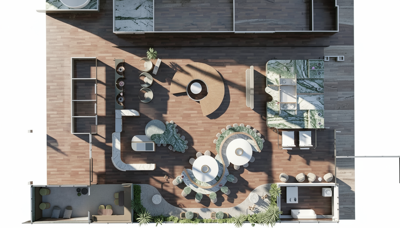 make the flooring a warmer slightly darker wood make the top right bathroom flooring less like marble and more like a subtle squared tile the bottom left should have a concrete flooring not marble