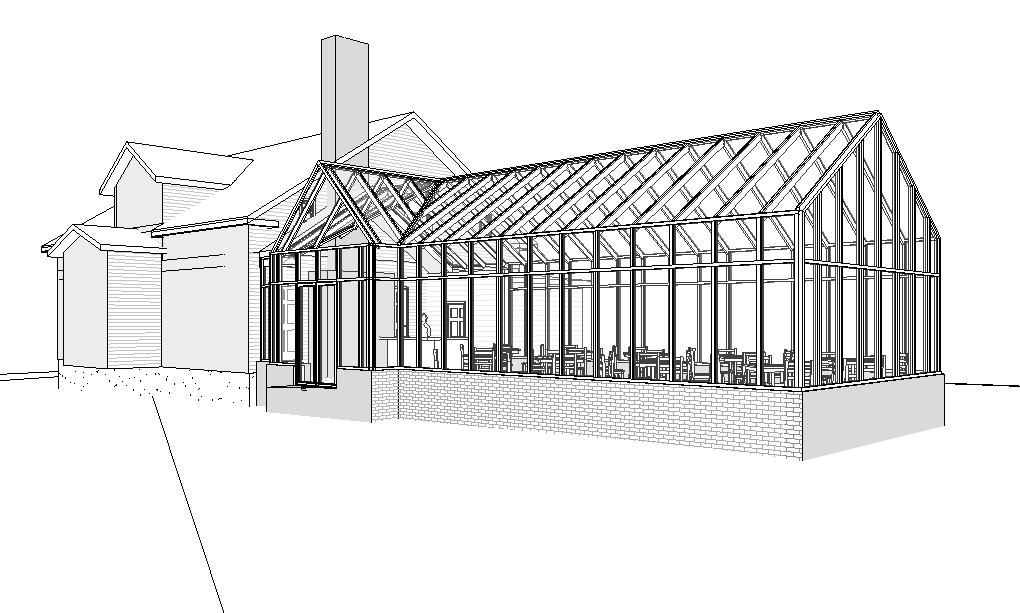 exterior shot render a serene and elegant conservatory connected to a craftsmen style house with a sophisticated and cozy atmosphere the roof and structural beams are gloss black contrasting with clear glass panels to allow natural light the main house exterior is white clapboard siding with cream yellow trim exuding a classic charm surrounding the conservatory lush green lawn and foliage adds a touch of nature the interior features warm rustic wooden furniture in natural oak tones basking in the golden glow of the afternoon the sky is a blend of vibrant blues and purples creating a calming and welcoming ambiance people walk about the site as they shop with their families