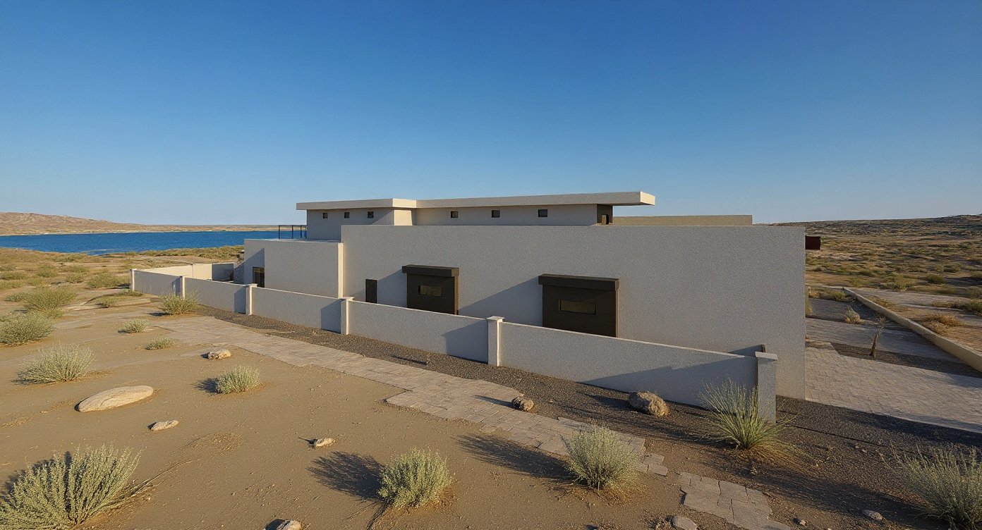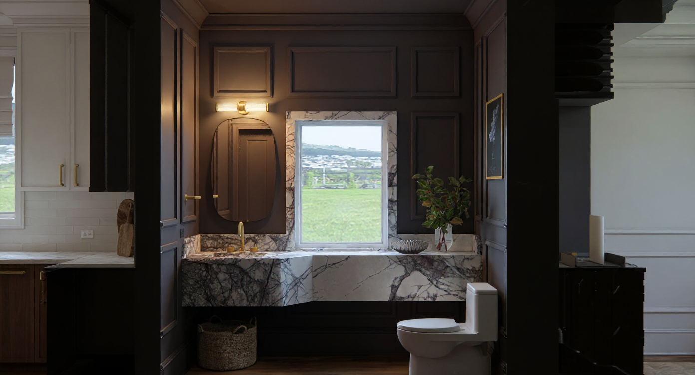 create an interior view of this wall the ceiling height is 11 the wall width is 19 4 the center section that is 8 wide protrudes forward 12 from the back wall from the chair rail to the floor the center section that is 8 wide protrudes forward 6 from the back wall from the ceiling to the top of the chair rail the back wall with the windows will have 2 vertical wood slats in a medium brown wood tone above the chair rail where shaded the floating shelf above the tv should be dark brown the finish around the tv and fireplace will be light marbled tile show an 80 tv with an ocean scene drywall finish under the window chair rail