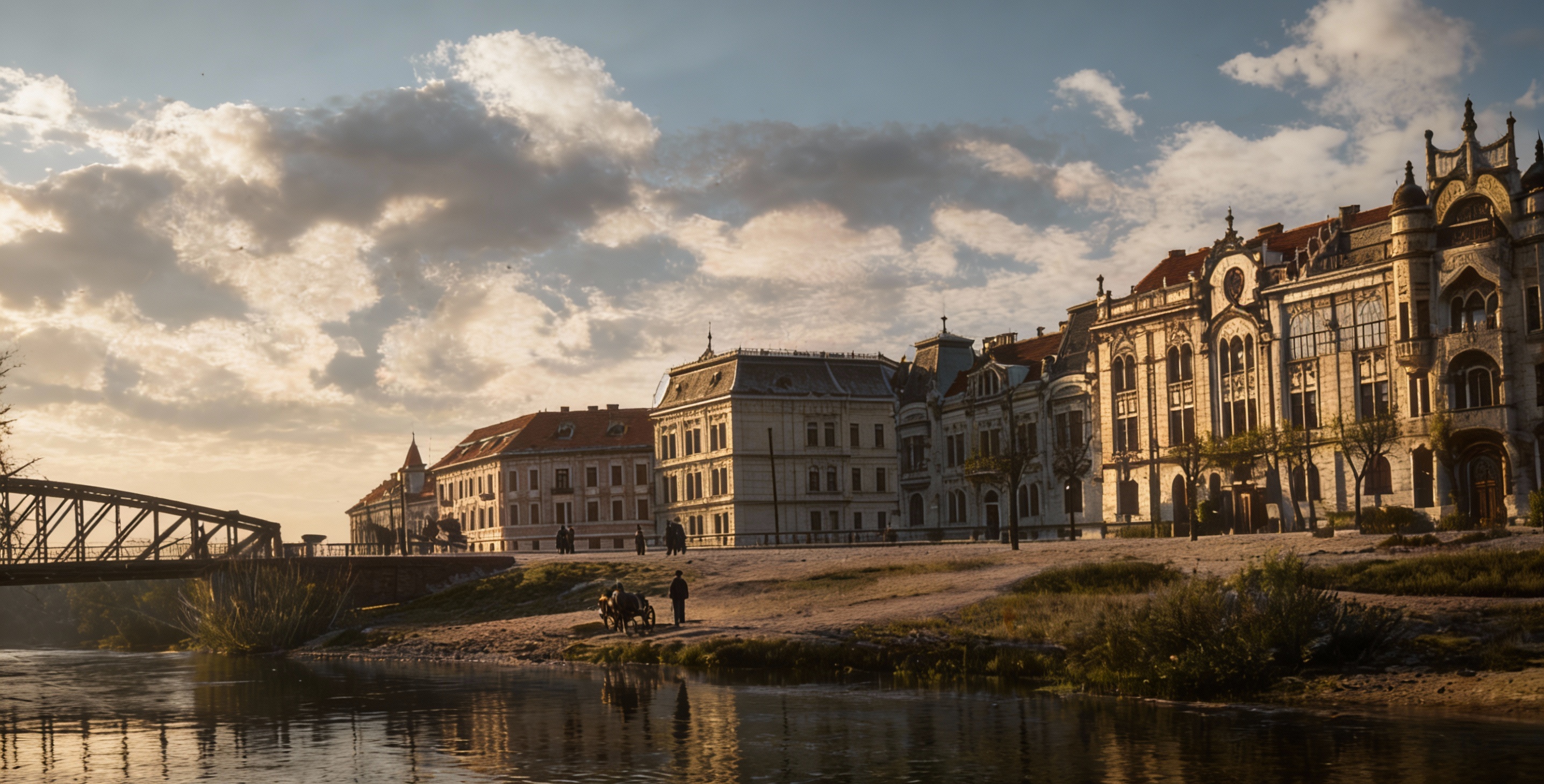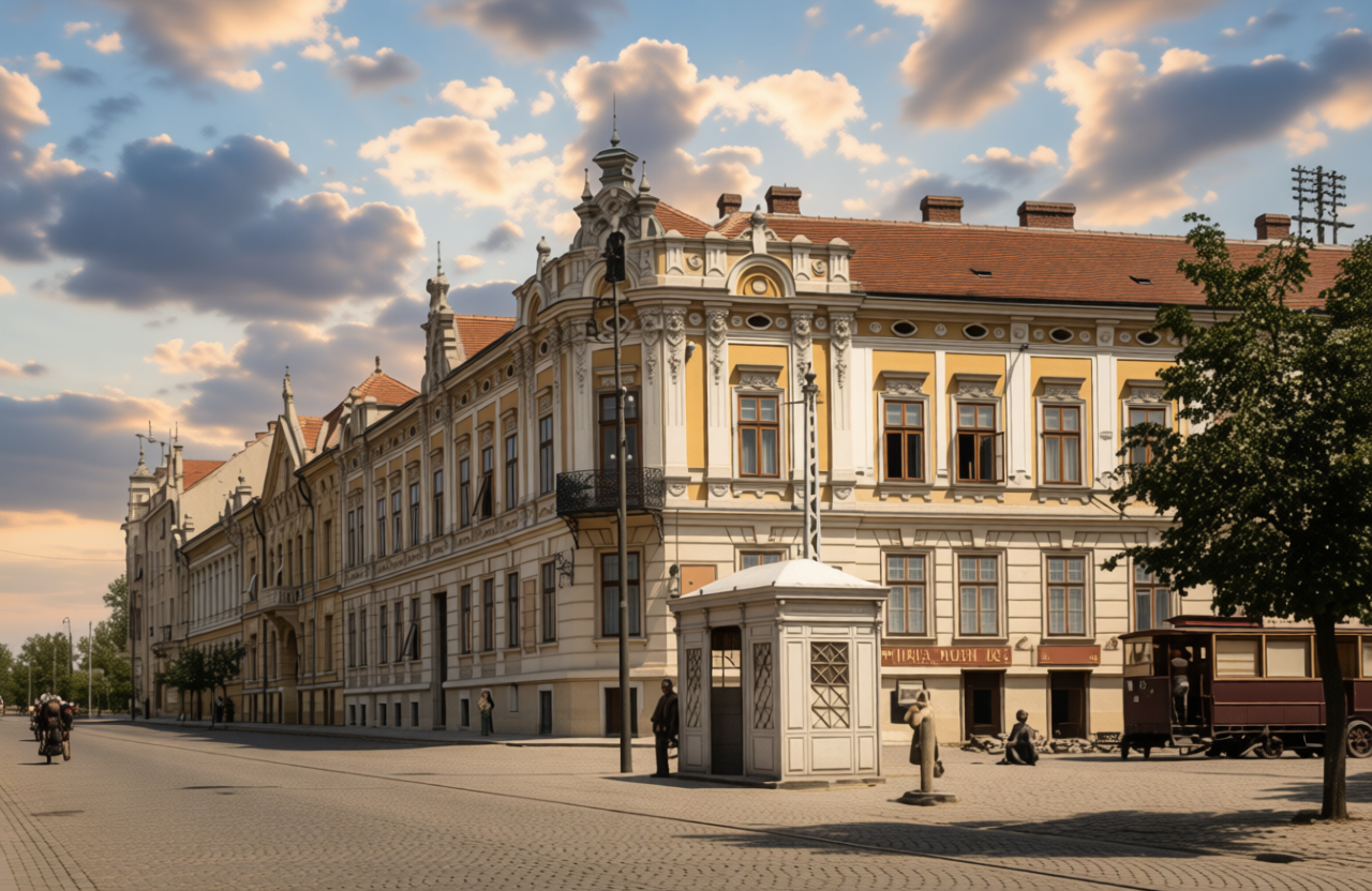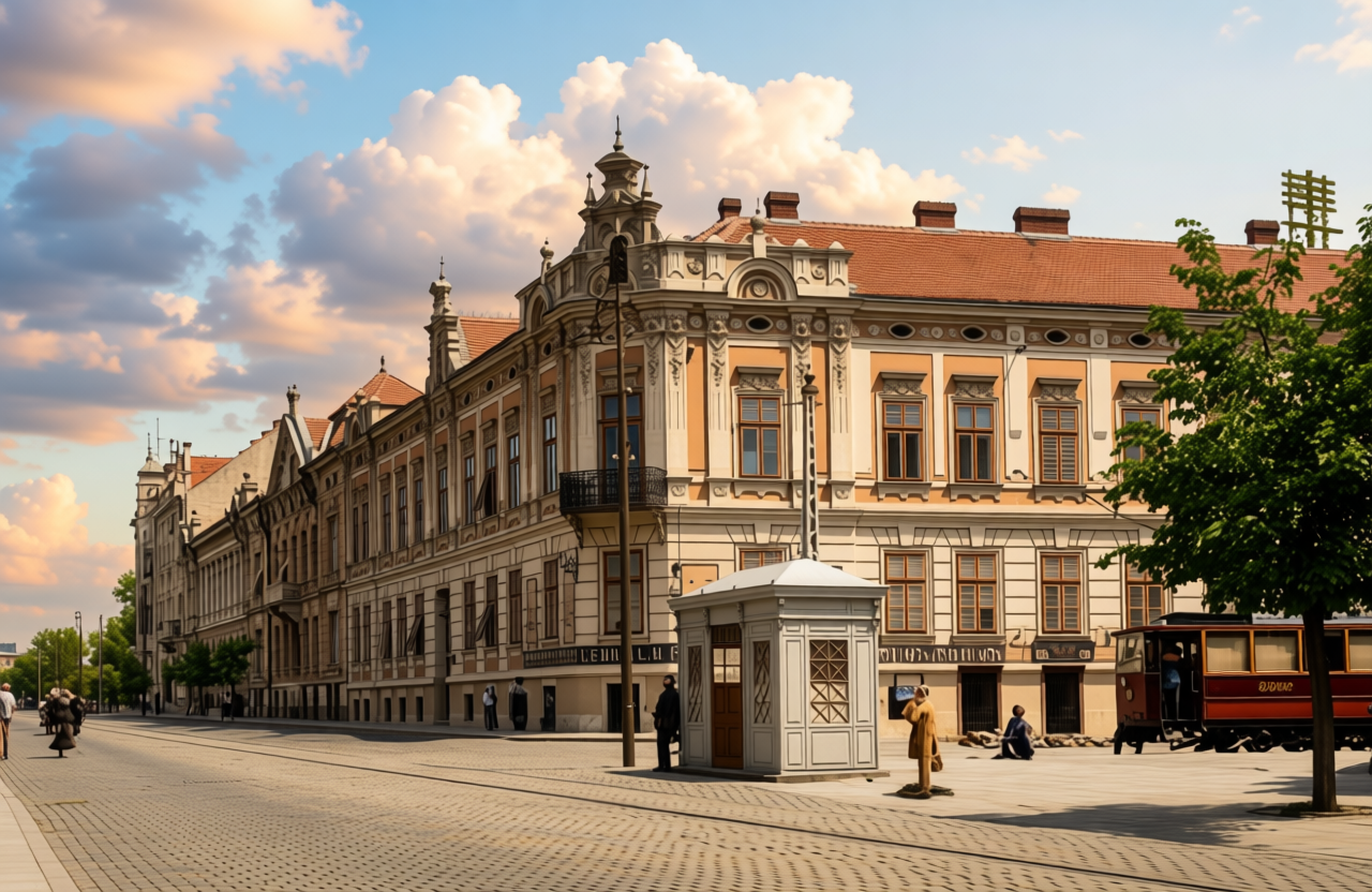 remove text from top of the picture beautyful clouds cinematic view 1900 s atmosphere black with white coloured trams more lenlighted hyperlight in the shadows
