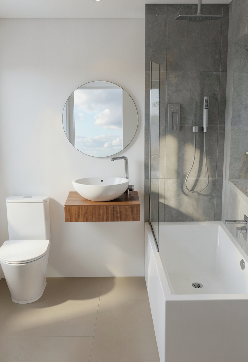 a modern bathroom with a sleek design feature a white ceramic toilet with graceful curves choose soft white walls for a clean and fresh look add a gray stone tile accent wall around the white bath include a large round frameless mirror above a floating wooden vanity in warm walnut tones with a white vessel sink the floor is matte beige tile bathe the room in natural light filtering through a window add subtle reflections and soft shadows to create a calm and inviting atmosphere with a minimalist elegance
