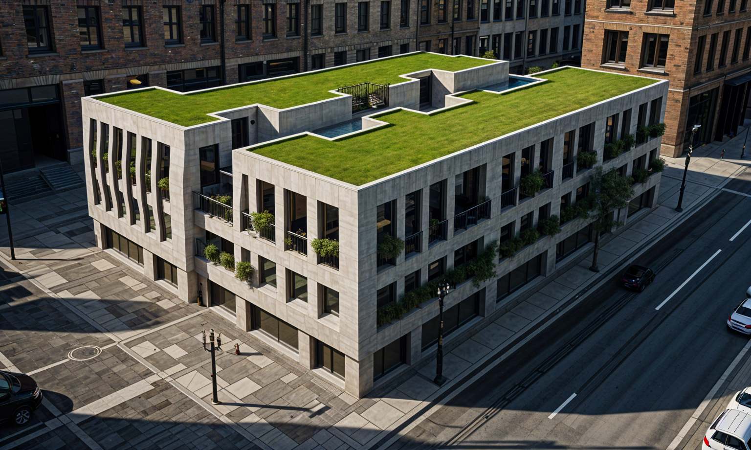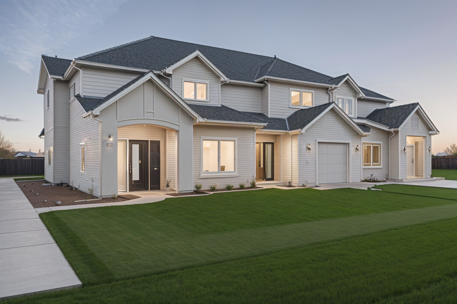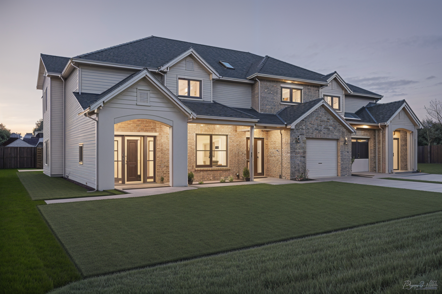 renaissance exterior shot make realistic with subtle stylistic suburban setting dusk lighting the spotted ground is grass the white ground is concrete architecture