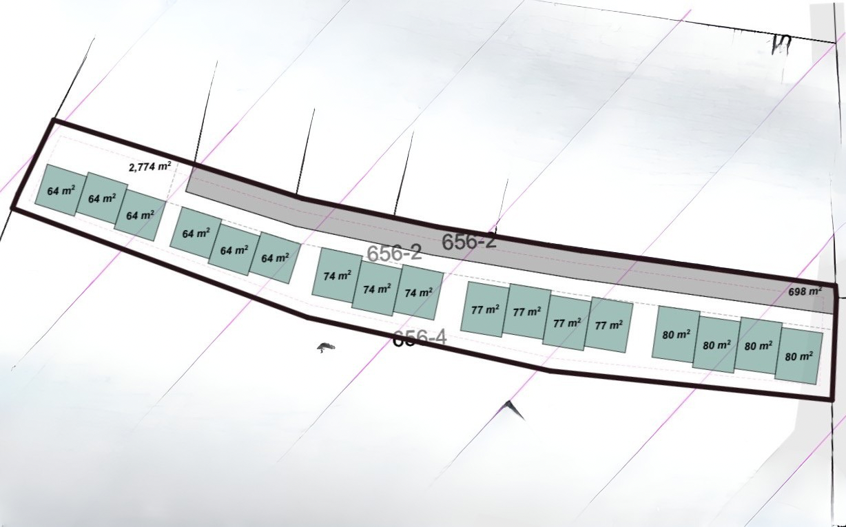 make 17 houses in the same format 3 3 3 4 4 in the style of the referencez make it 3d and in one row just like the parcel and the house drawings