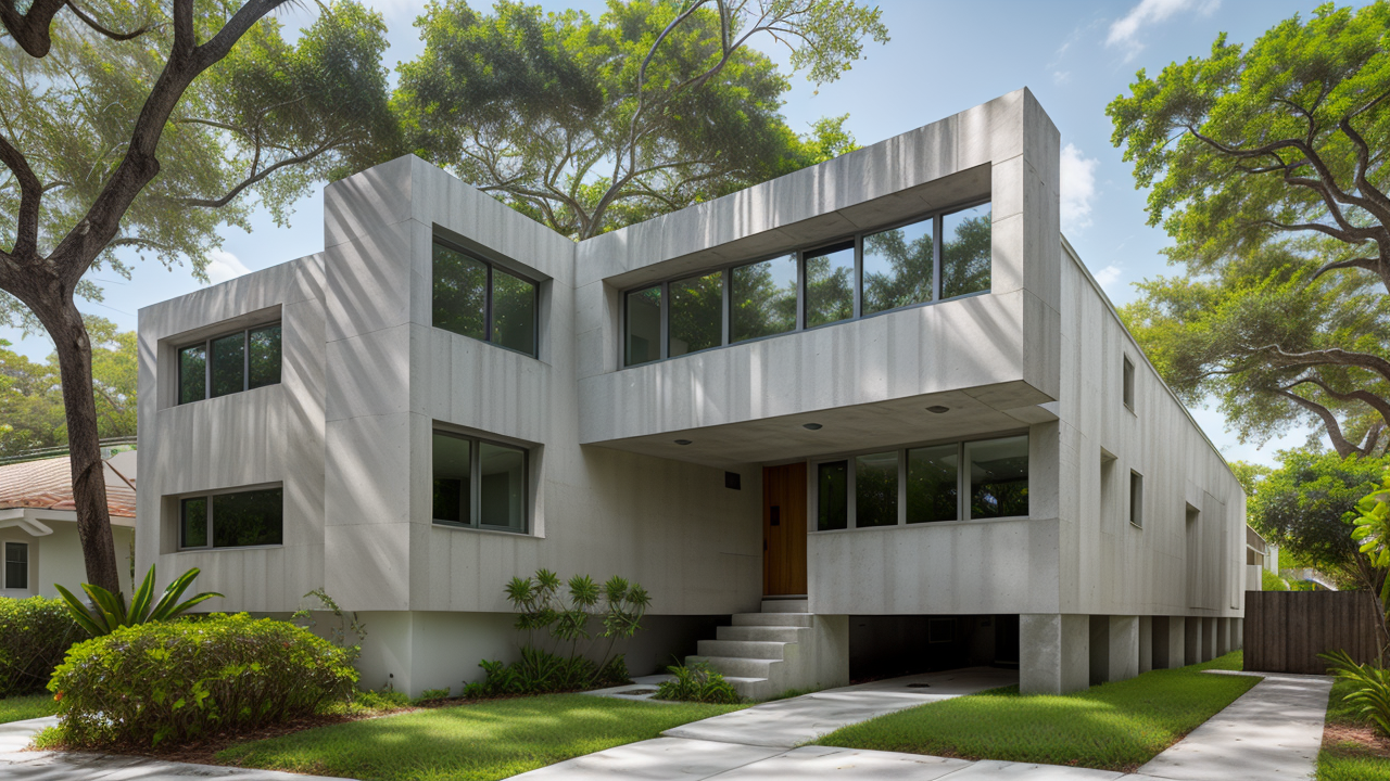 modernist exterior shot accessory dwelling unit adu north miami suburban infill architecture addressing informal density compact rear yard adu rectilinear massing one and a half story volume thick walls strong section material system exposed reinforced cmu block walls no paint no stucco combined with wood roof structure and wood infill panels cmu walls read as heavy continuous and fire rated along property lines architectural language quiet deliberate tectonic compatible with the main miami bungalow but clearly secondary and contemporary built ins only architecture as furniture built in bed desk kitchen dining bench stair storage and book wall for 500 books all carved into wall thickness no loose furniture poetic place idea space ppis an inglenook like reading space carved from a thick cmu wall deeply recessed with built in seating and bookshelves light enters indirectly through a clerestory or narrow vertical slot creating contrast shadow and time based light movement outdoor condition restrained garden minimal planting kitchen garden integrated into architecture covered porch as threshold not lounge atmosphere calm restrained heavy quiet emphasis on mass shadow thickness and light as material representation architectural visualization neutral tones no pillows no d cor styling no people strong shadows clear construction logic architecture