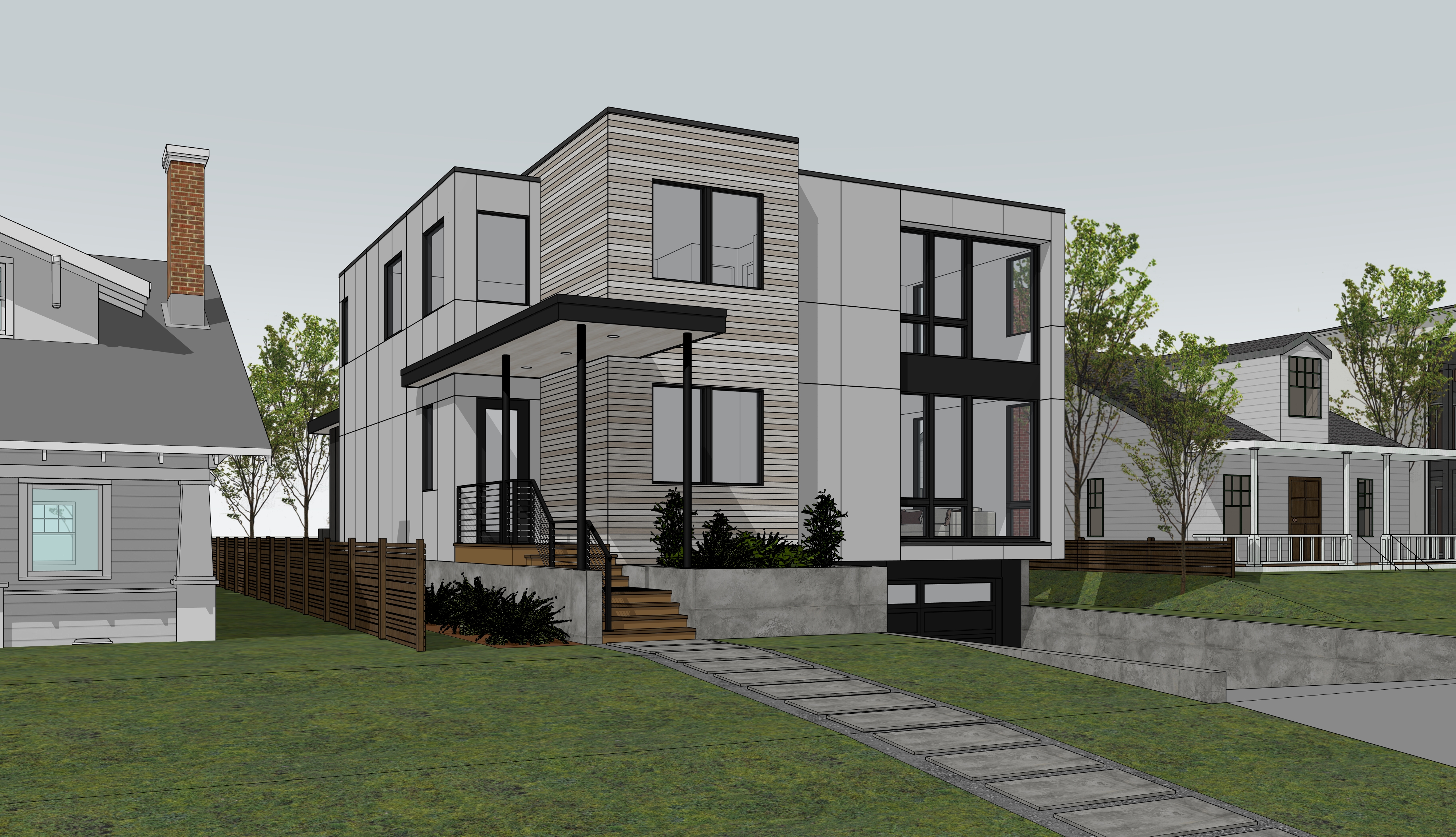 render a modern suburban house with a sleek minimalist design the main structure has clean lines and a mix of materials use light gray hardie board for the walls with accents of a white washed wood horizontal siding large windows provide a transparent look the stairs to the house are made of a warm brown wood the foreground shows a well kept lawn in vibrant green with a path made of light gray concrete pavers that are 2 feet by 6 feet placed in gravel surrounding trees are lush with bright green leaves the sky is a clear soft blue creating a serene and inviting atmosphere the neighboring homes also have well kept landscaping