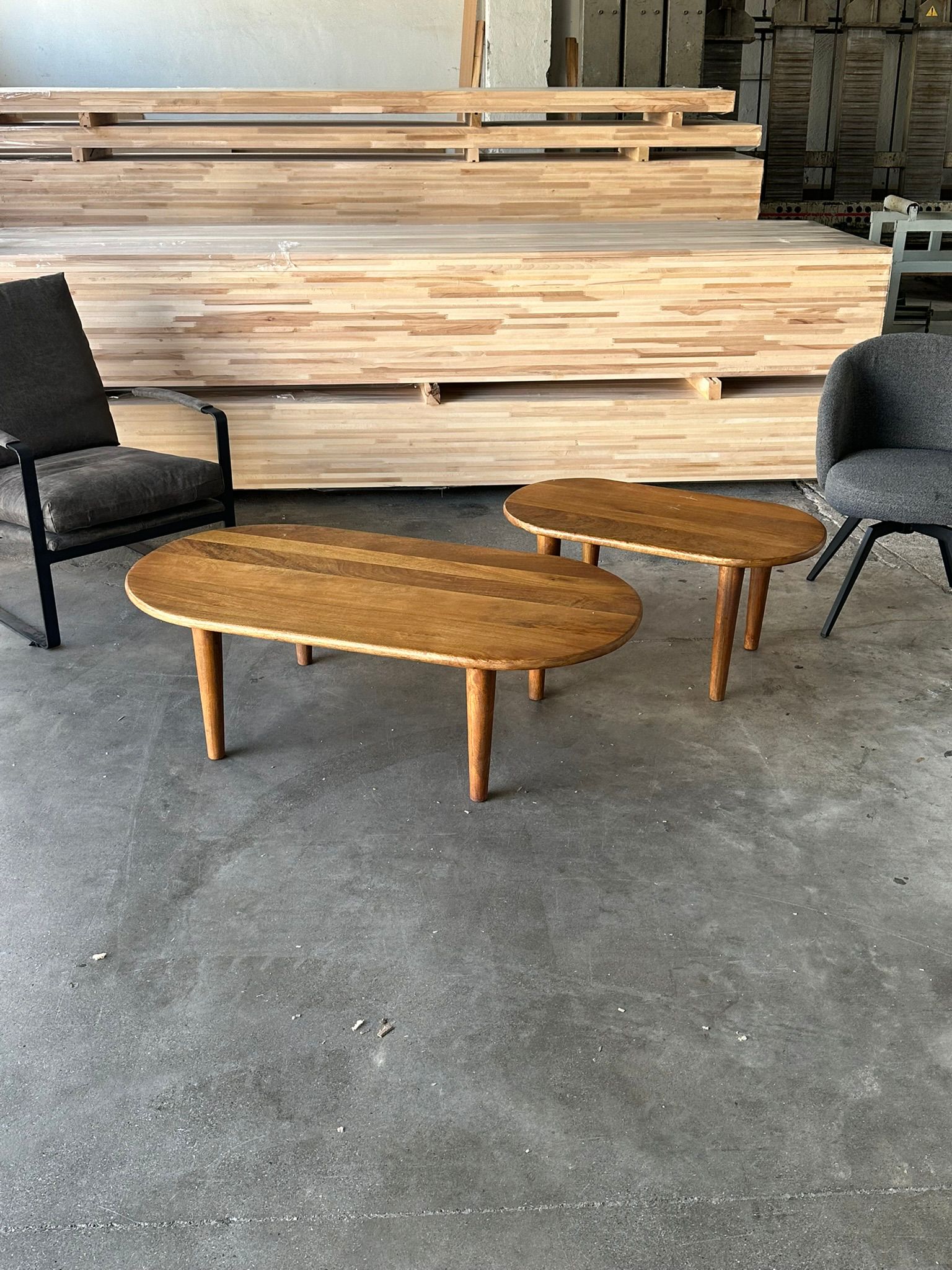 editorial product photography of two sculptural coffee tables displayed together in a calm minimalist architectural space soft natural light warm neutral tones deep shadows cinematic composition the tables feel like design objects in a gallery high end european interior style quiet luxury museum like atmosphere no people no decorations no logos no text ultra realistic