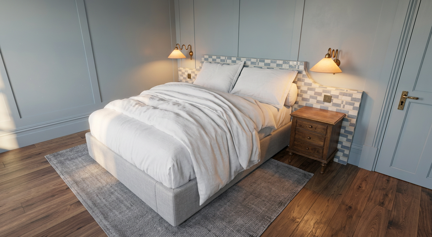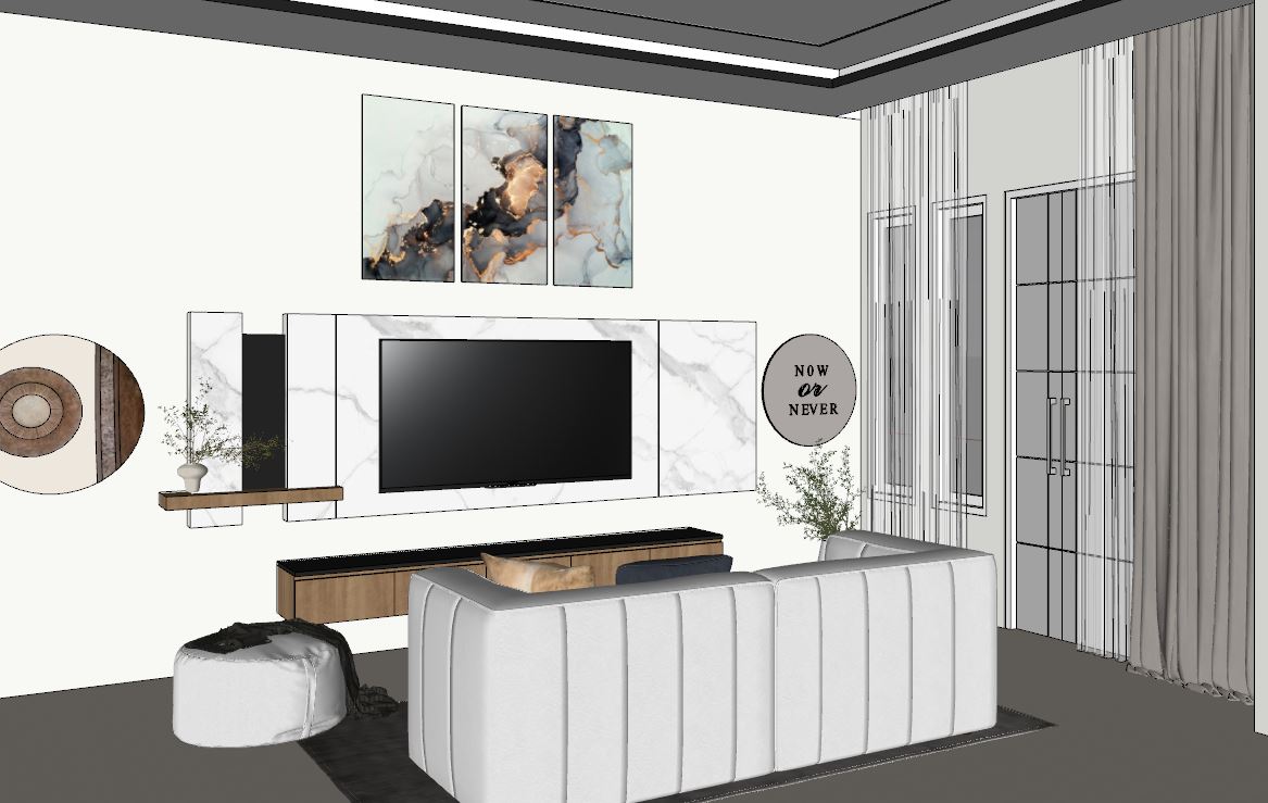 buat gambar ultra realistis tanpa mengubah struktur bentuk desain atau material apa pun jangan mengubah ukuran jpeg lantai menggunakan keramik glossy warna beige dinding warna off white dan plafond warna putih tambah lampu spot light di plafond dan tambah lampu indirect light ke curtain valance dan dro ceiling dan jangan ubah material warna dan bentuk