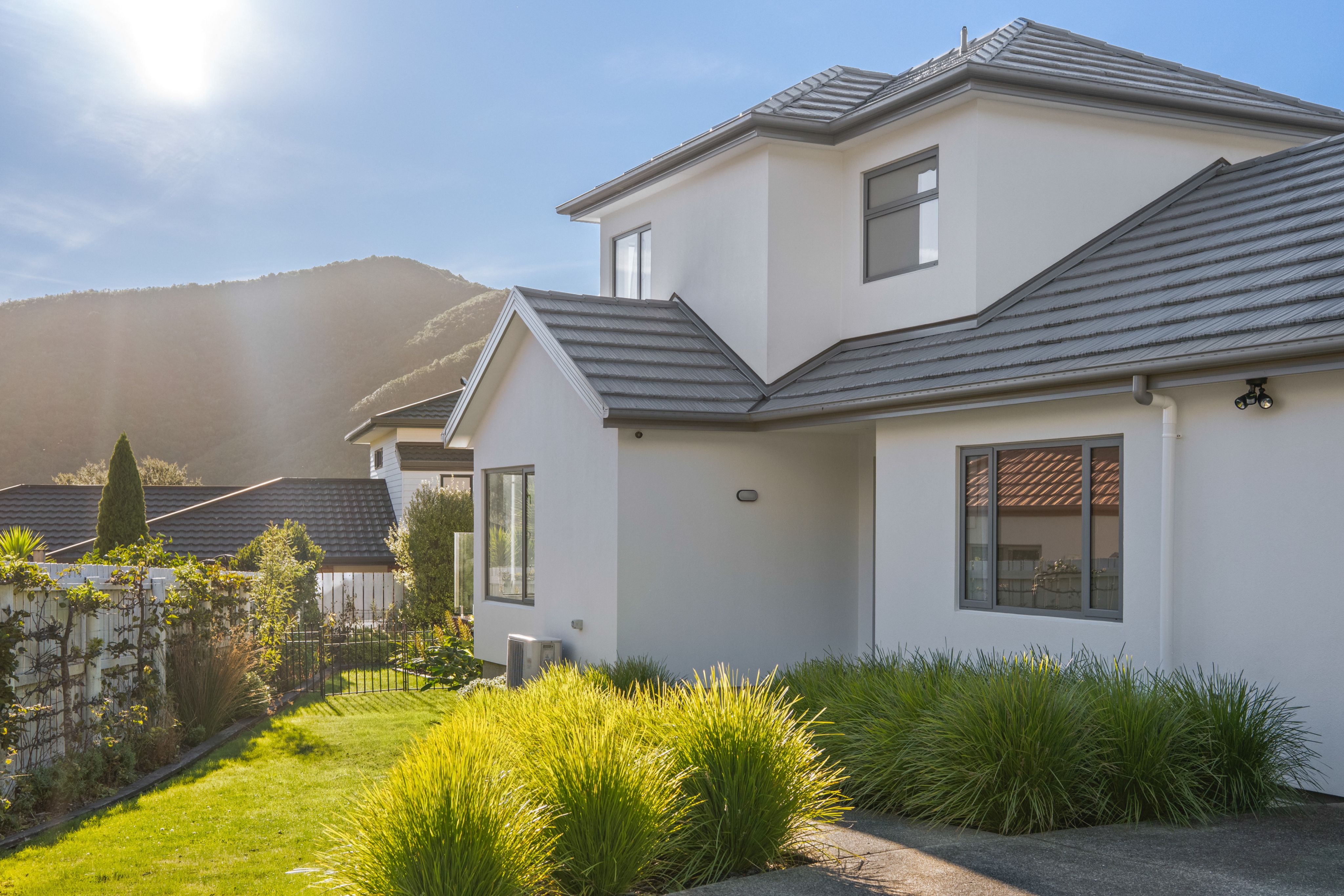 twilight remove shadows change the sky to a soft vibrant sunset the house is lit with subtle warm temp lighting maintain realistic subtle pink wispy sky don t add lights or windows that are not there or change gardens etc darken foreground