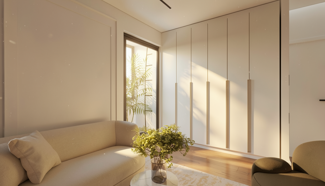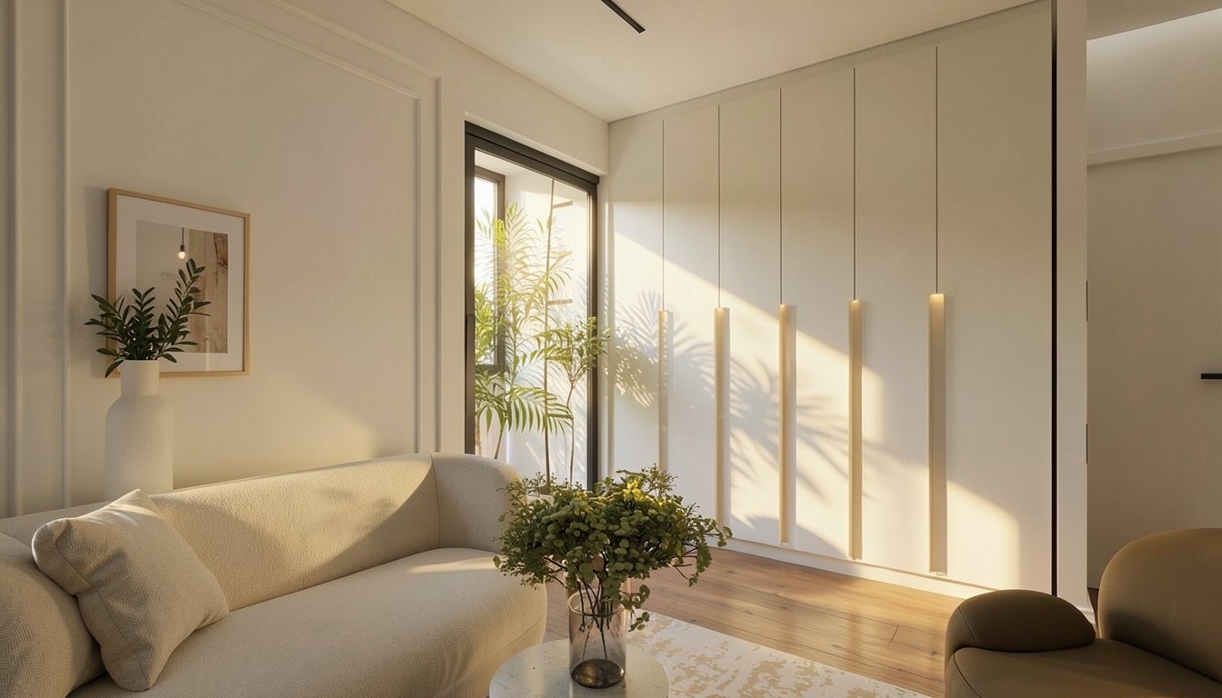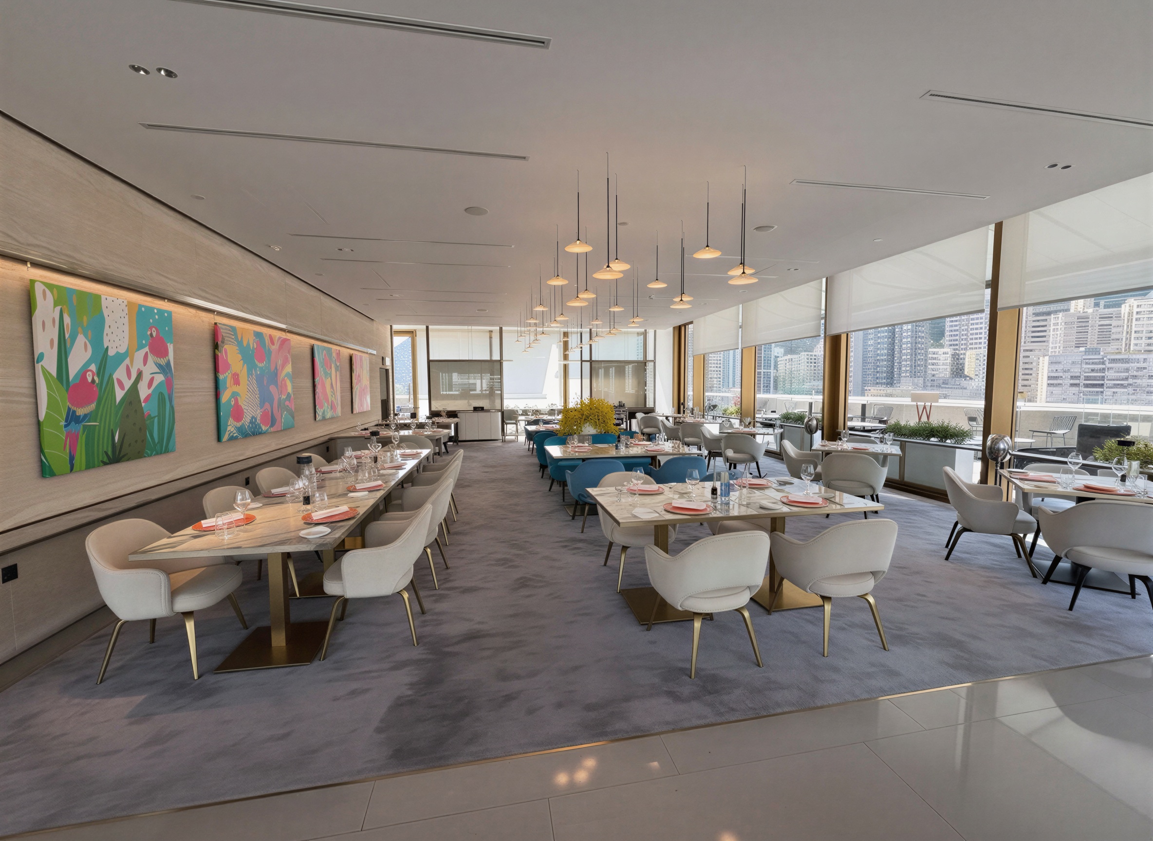 photorealistic interior restaurant rendering preserve exactly do not modify gray textured carpet flooring throughout entire space marble dining table tops with brushed gold brass base frames ceiling white plaster with recessed linear lighting cascading cluster pendant lights brass stems disc shades left wall light oak wood panel cladding colorful tropical art paintings on left wall pink flamingos green leaves vibrant pop art style keep exactly right side floor to ceiling windows with city skyline view white roller blinds partially drawn all table settings wine glasses pink coral placemats white plates cutlery preserve precisely yellow flower centerpiece on center table modify chair colors as follows left zone long banquet seating row along left wall all chairs in this zone change upholstery to forest green rich deep green smooth fabric or leather finish same rounded bucket chair silhouette preserved green tone deep sage forest not bright sophisticated center and right zones all remaining chairs maintain light gray upholstery same warm dove gray as original right side chairs smooth fabric rounded form preserved all chair legs throughout entire restaurant change from brushed gold brass metal legs change to dark walnut wood grain legs medium dark brown natural wood texture visible tapered slim wooden leg form matte natural wood finish no gloss consistent dark walnut tone on every chair in space result three zone color reading left green chairs dark wood legs center right gray chairs dark wood legs tables marble tops brass gold base frames unchanged gray carpet unified throughout lighting preserve original warm pendant light cascade natural daylight from windows no change to light quality or direction quality 8k architectural interior photography photorealistic render quality architectural digest restaurant editorial wide angle perspective preserved from original ar 16 9 style raw stylize 150 q 2 v 7
