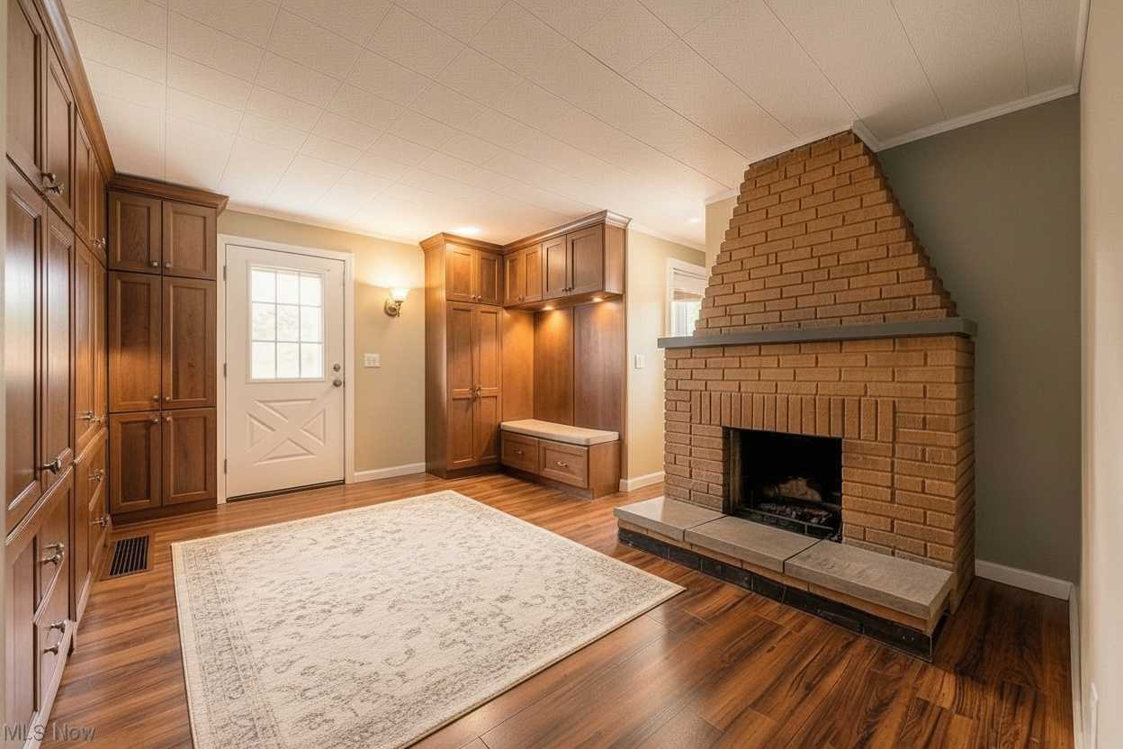 make the millwork cabinetry have a more midcentury modern style update the color scheme to be more midcentury modern too