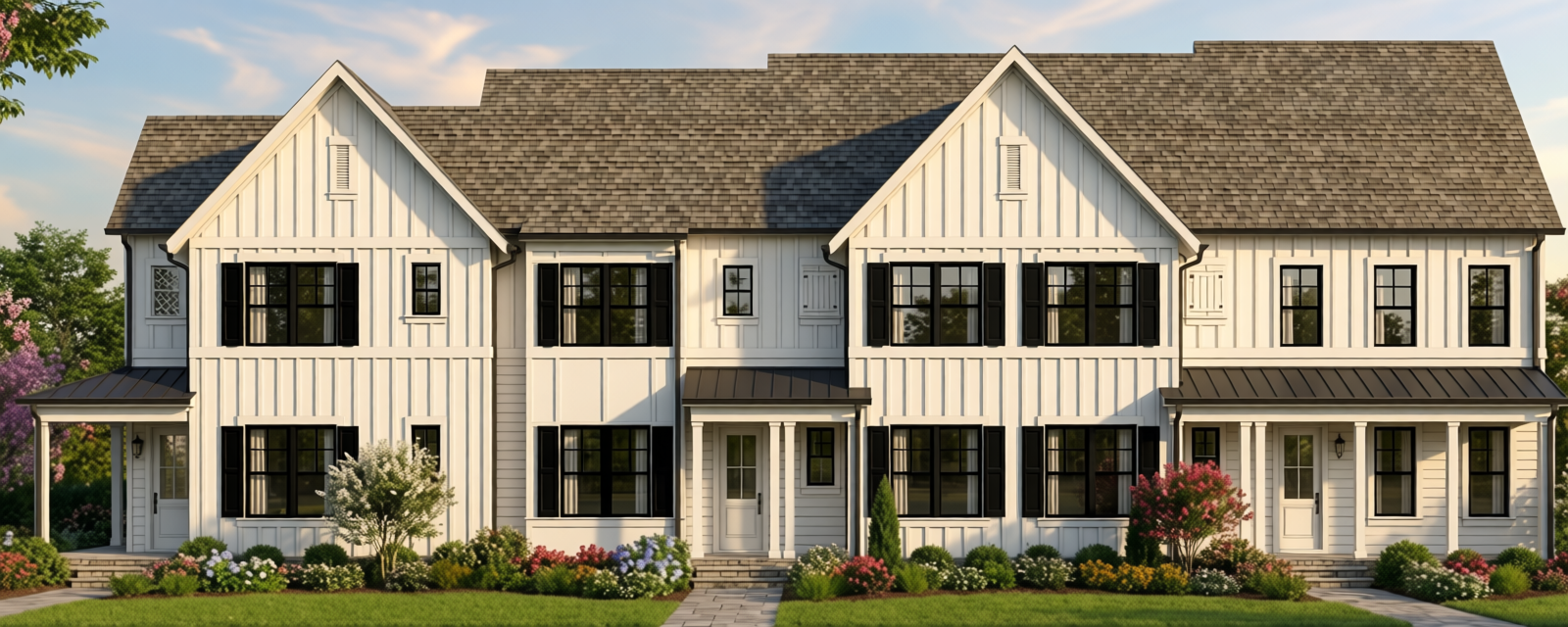farmhouse style elevation with white siding and trim the window sashes should be black the upper roof should be a warm dark grey asphalt shingle and the lower roofs should be a warm dark bronze metal landscape should typical of north carolina piedmont region and a daytime elevation rendering keep siding materials the same do not change