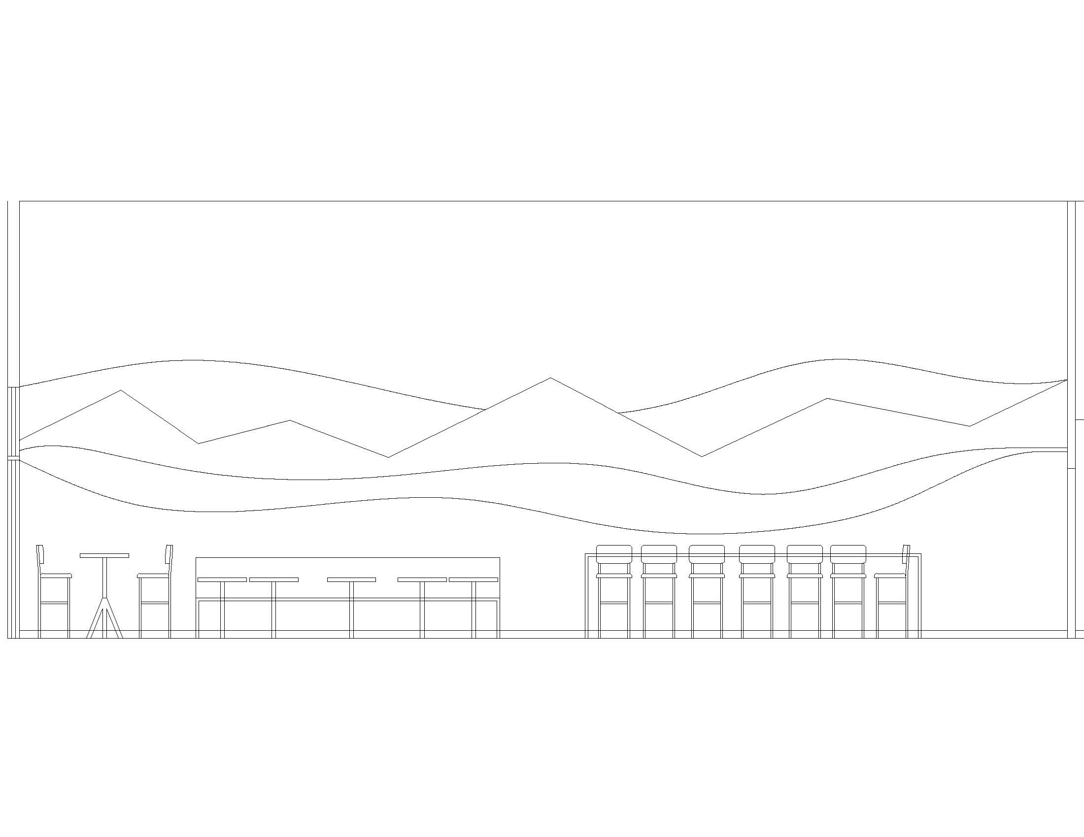 show a coffeeshop feature wall with a stylized mountain scene in warm colors on the wall shoe a built in bench with small tables and chairs in front and a 42 high built in bartop with barstool seating