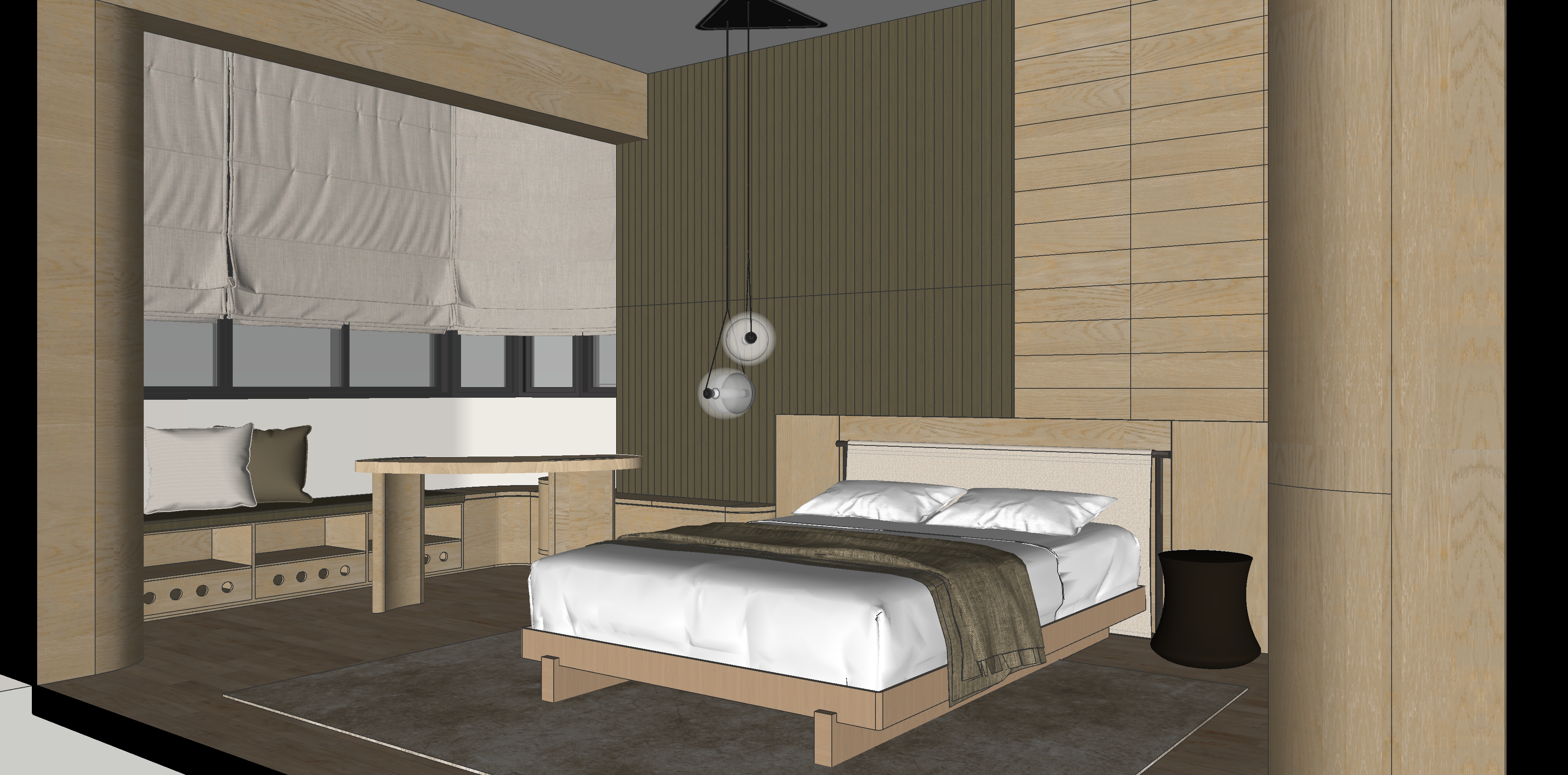 change the wood colour into blonde wood and remain the green vertical wood panel make the wood grain smaller looks like more laminate